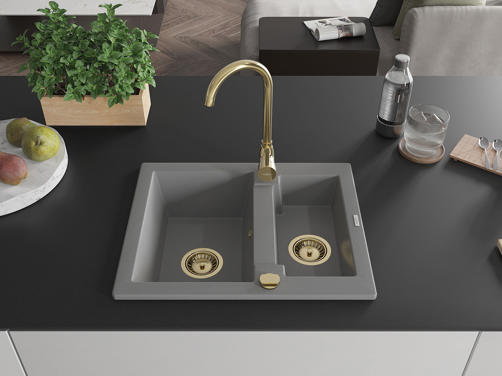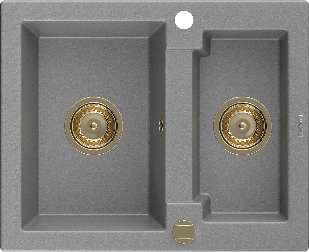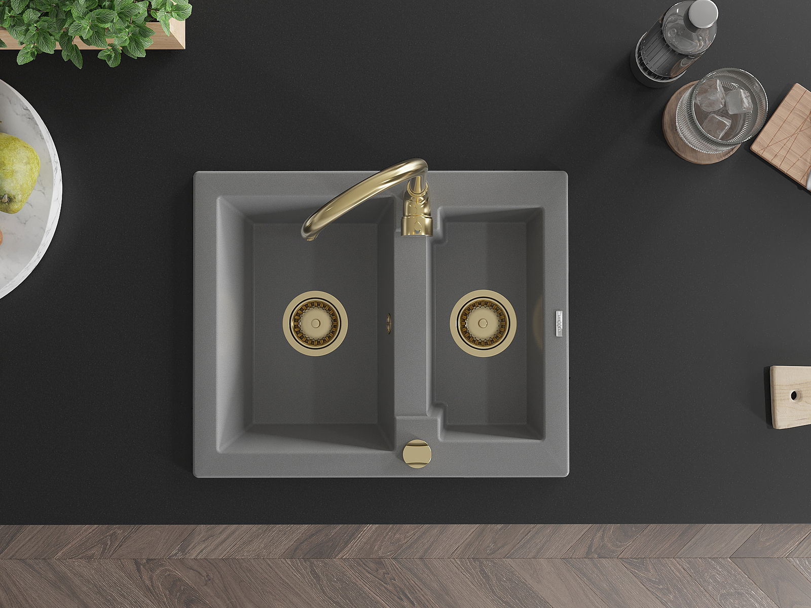 Mexen Carlos granitový dřez 1,5-komorový 582 x 475 mm, šedý, sifon zlatý - 6518581500-71-G