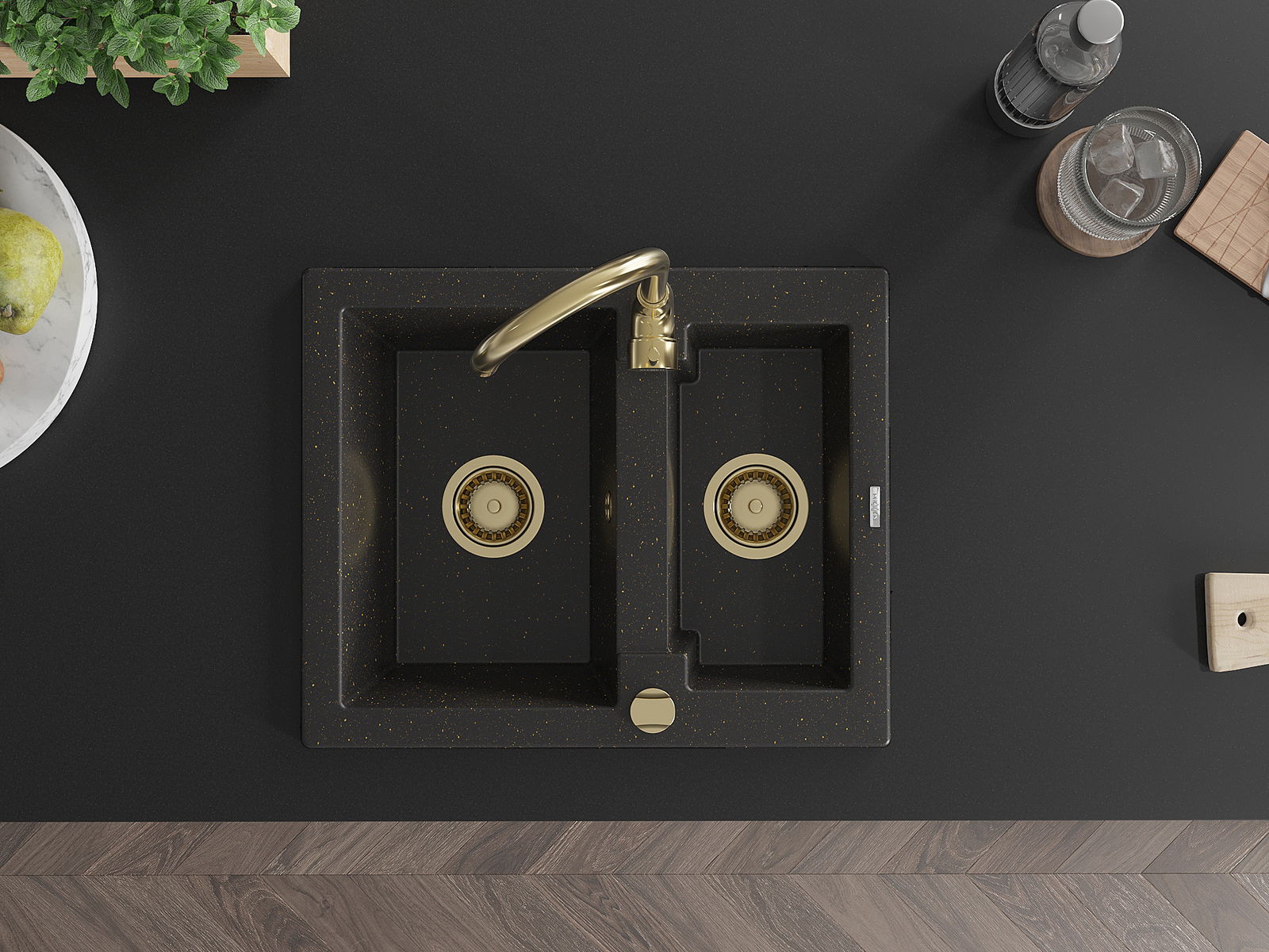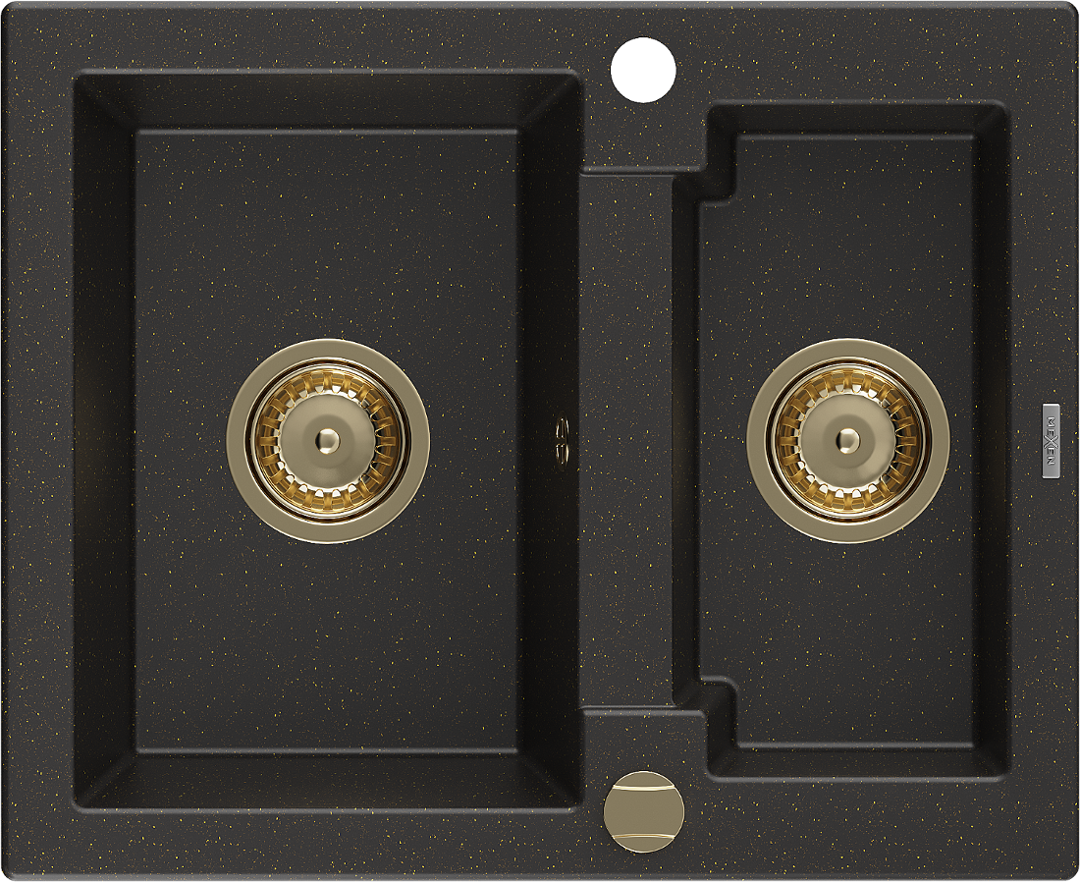 Mexen Carlos žulový dřez 1,5-komorový 582 x 475 mm, černý/zlatý metalik, sifon zlatý - 6518581500-75-G