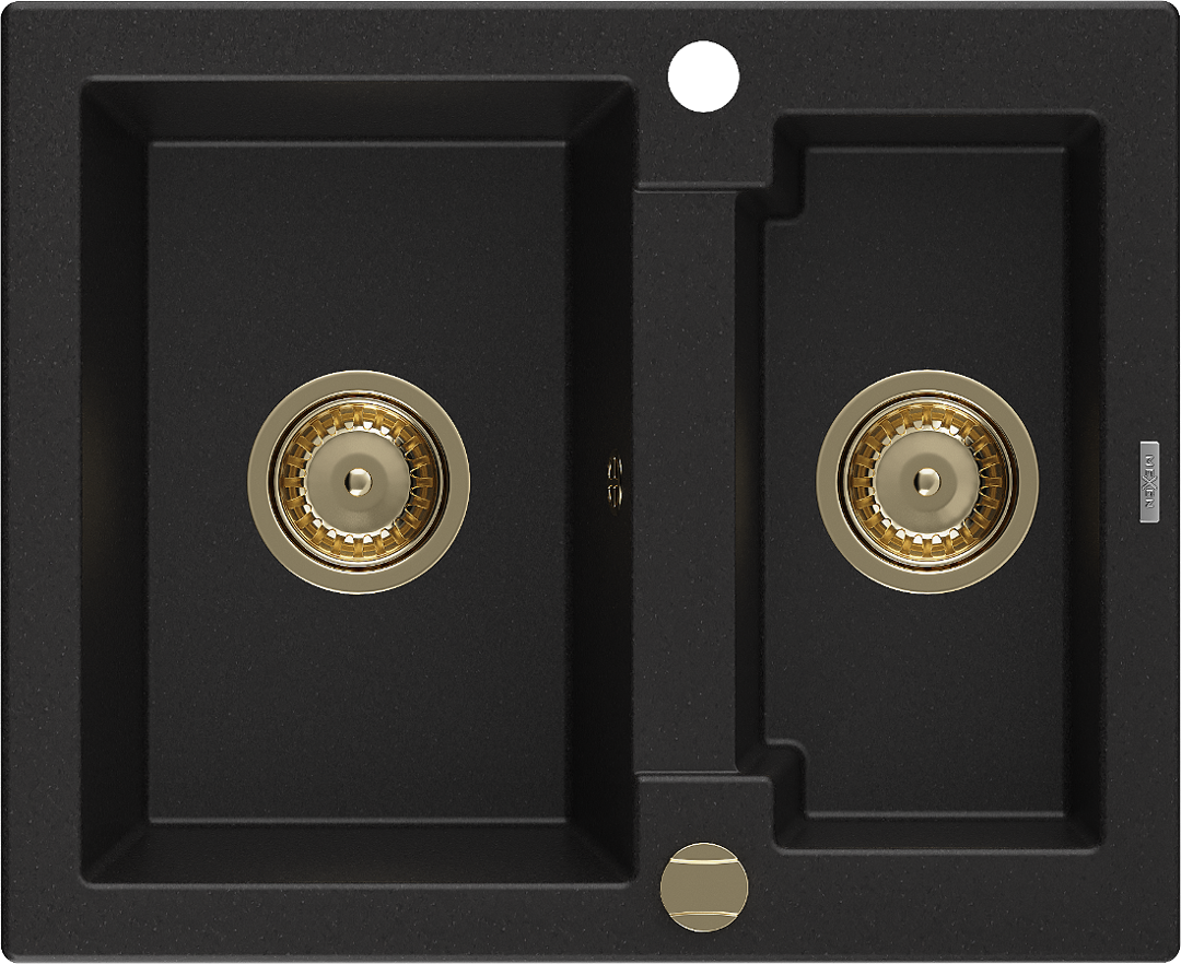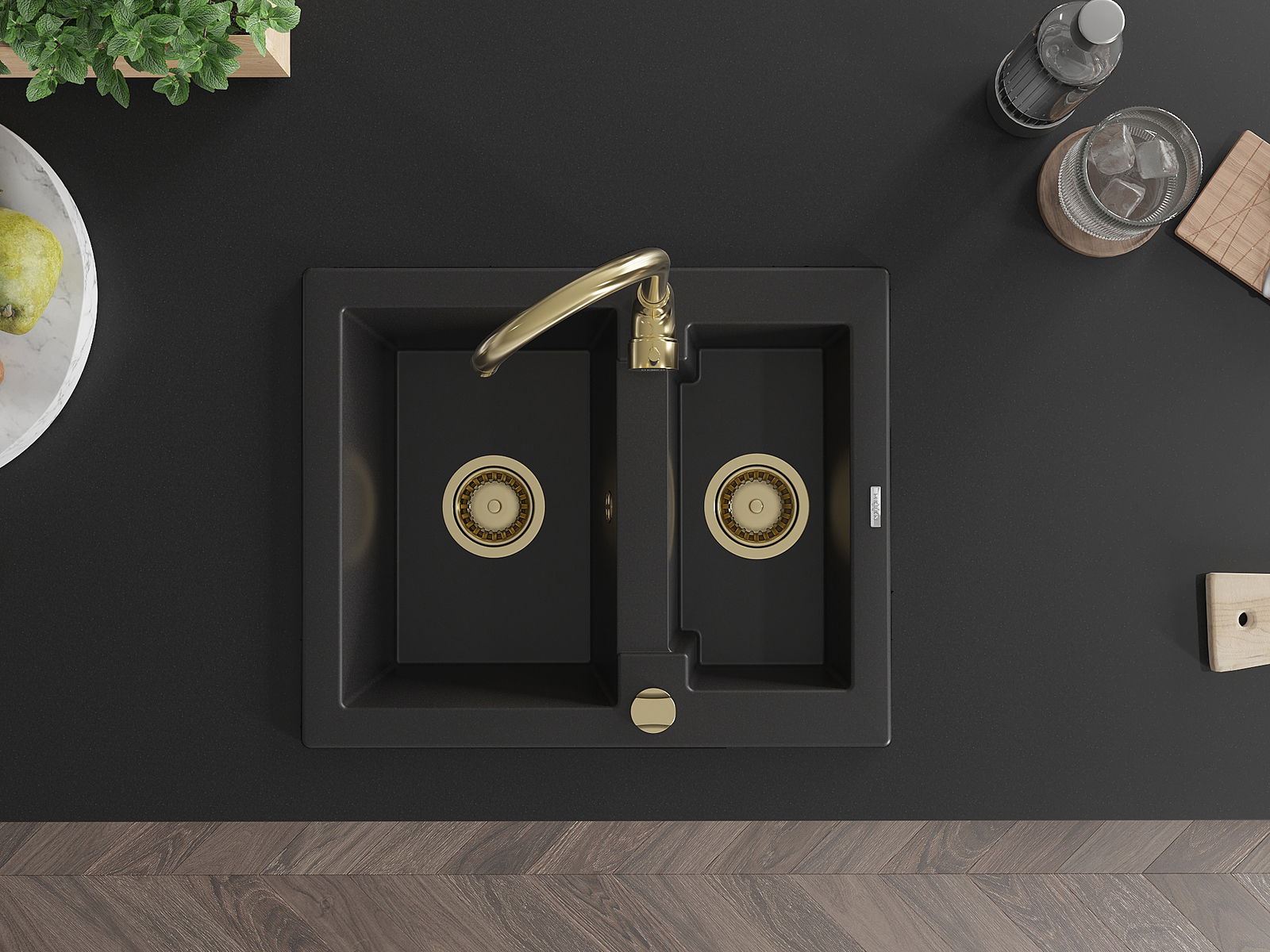 Mexen Carlos granitový dřez 1,5-komorový 582 x 475 mm, černý, sifon zlatý - 6518581500-77-G