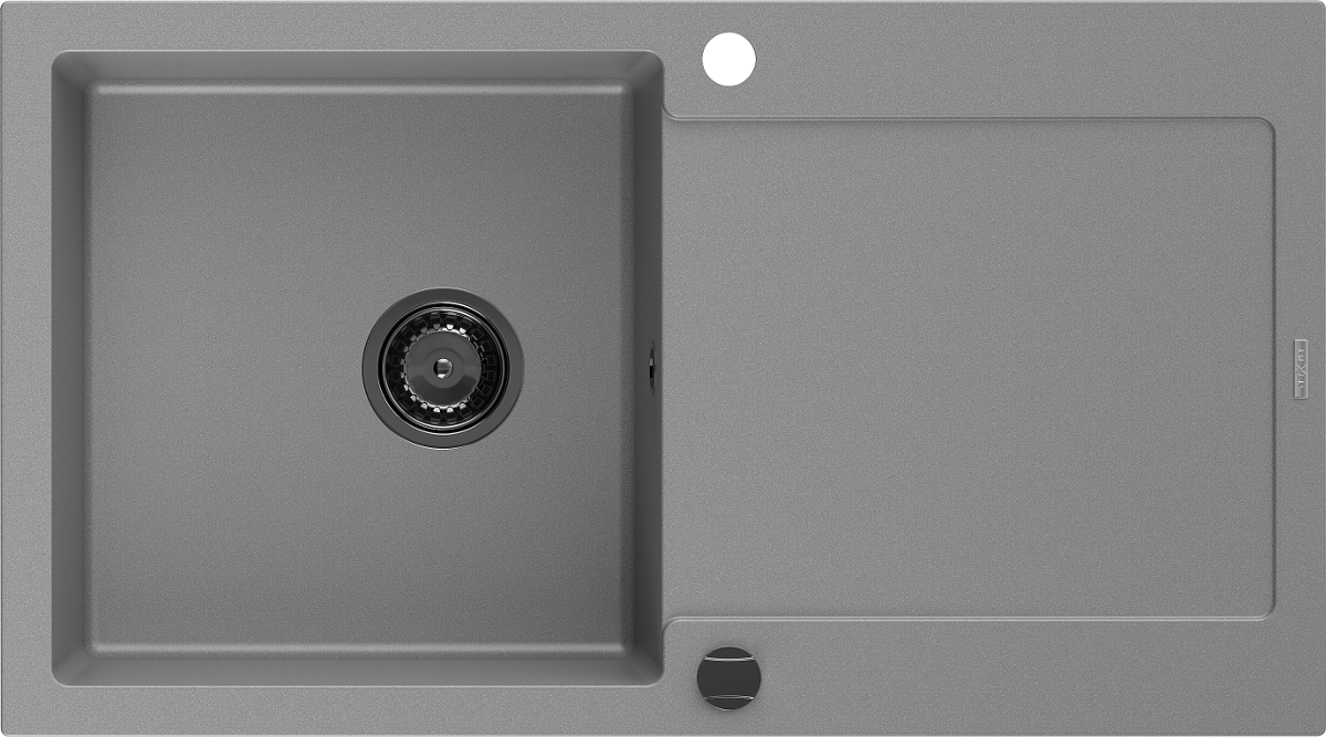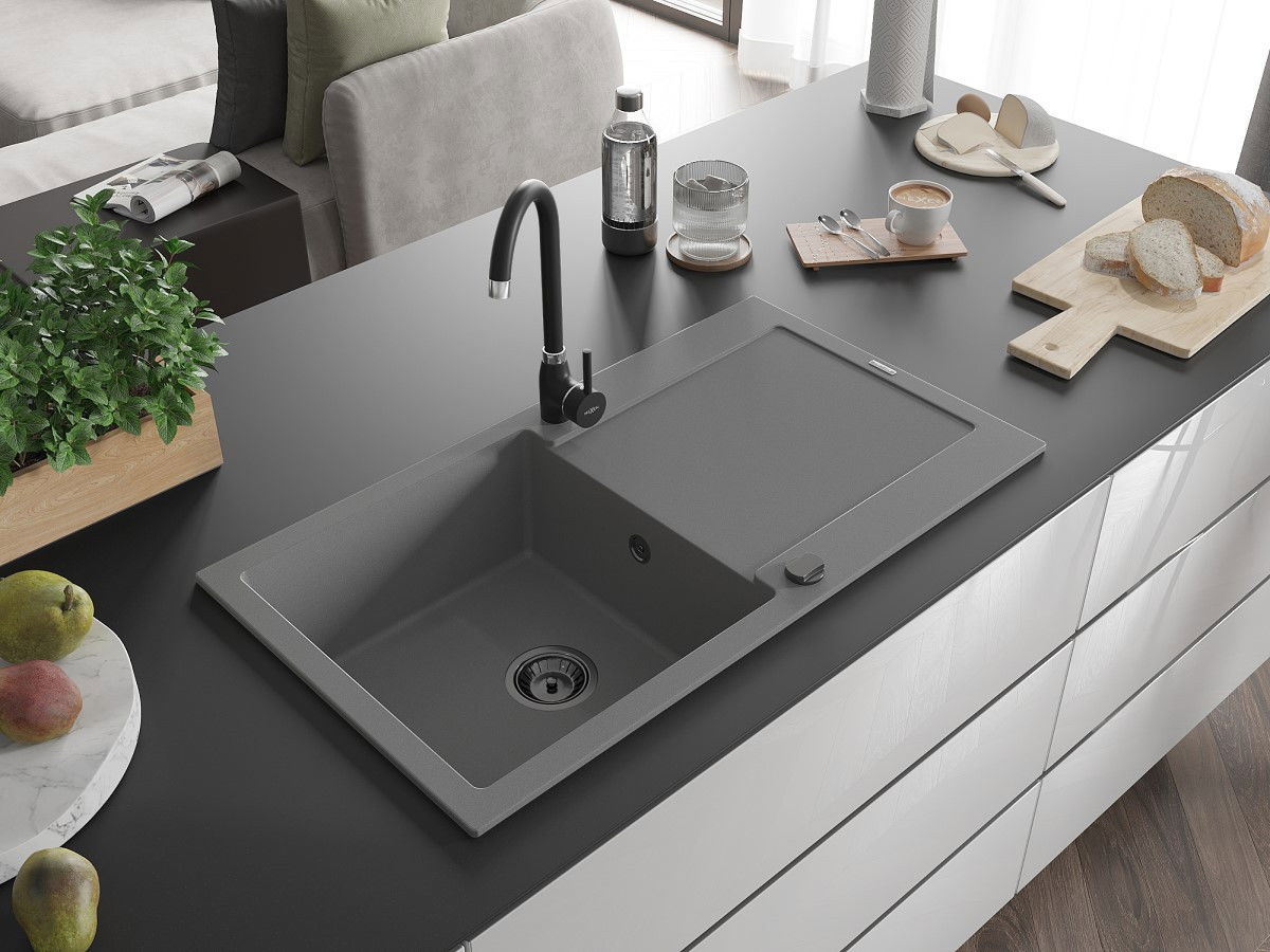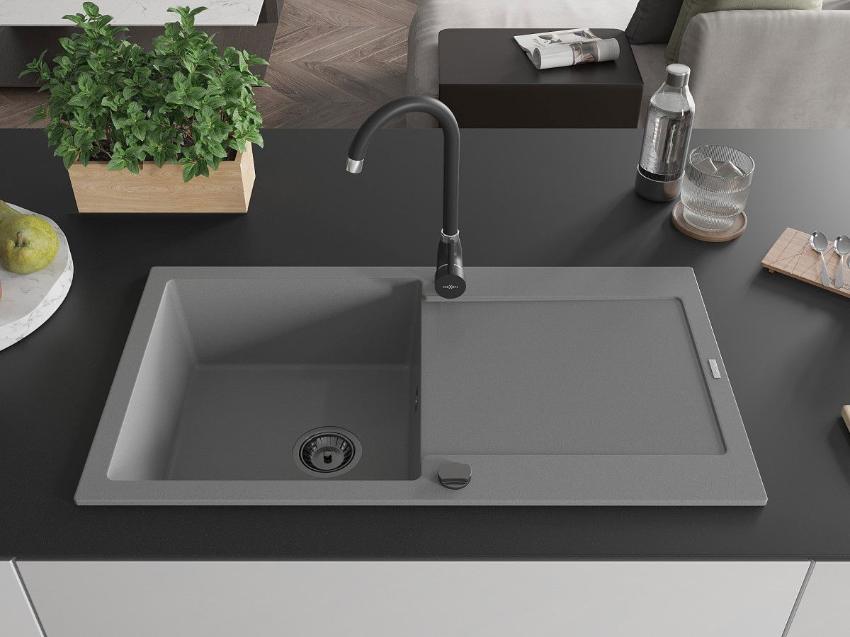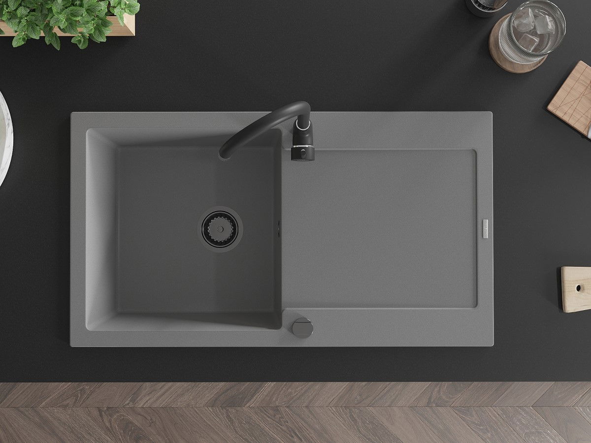 Mexen Leo granitový dřez s odkapávačem 1-komorový 900 x 500 mm, šedý, černý sifon - 6501901010-71-B