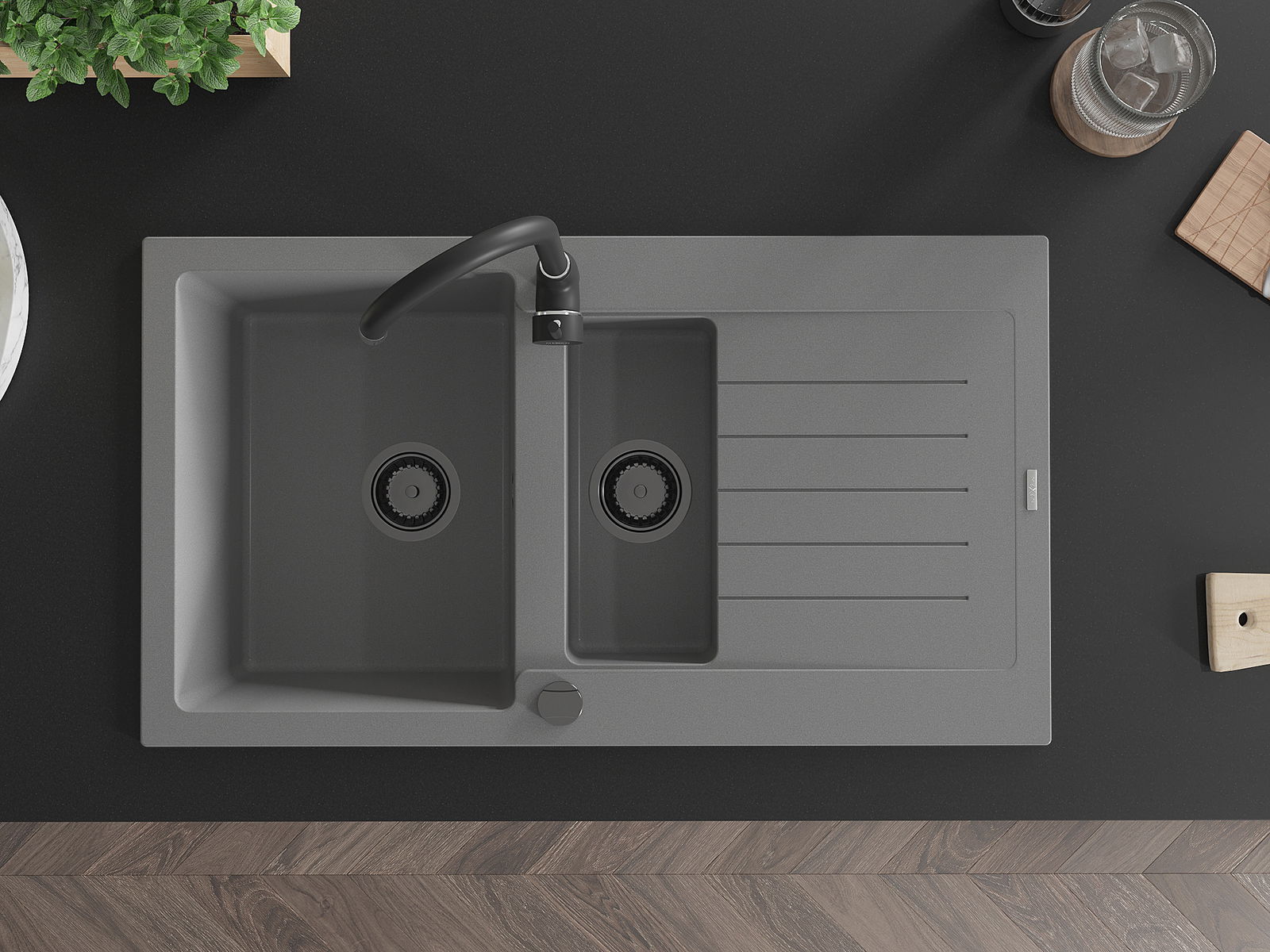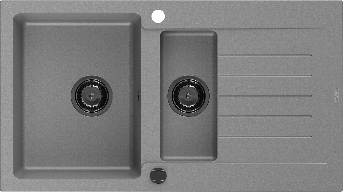 Mexen Matias granitový dřez 1,5-komorový s odkapávačem 900 x 505 mm, šedý, černý sifon - 6502901505-71-B