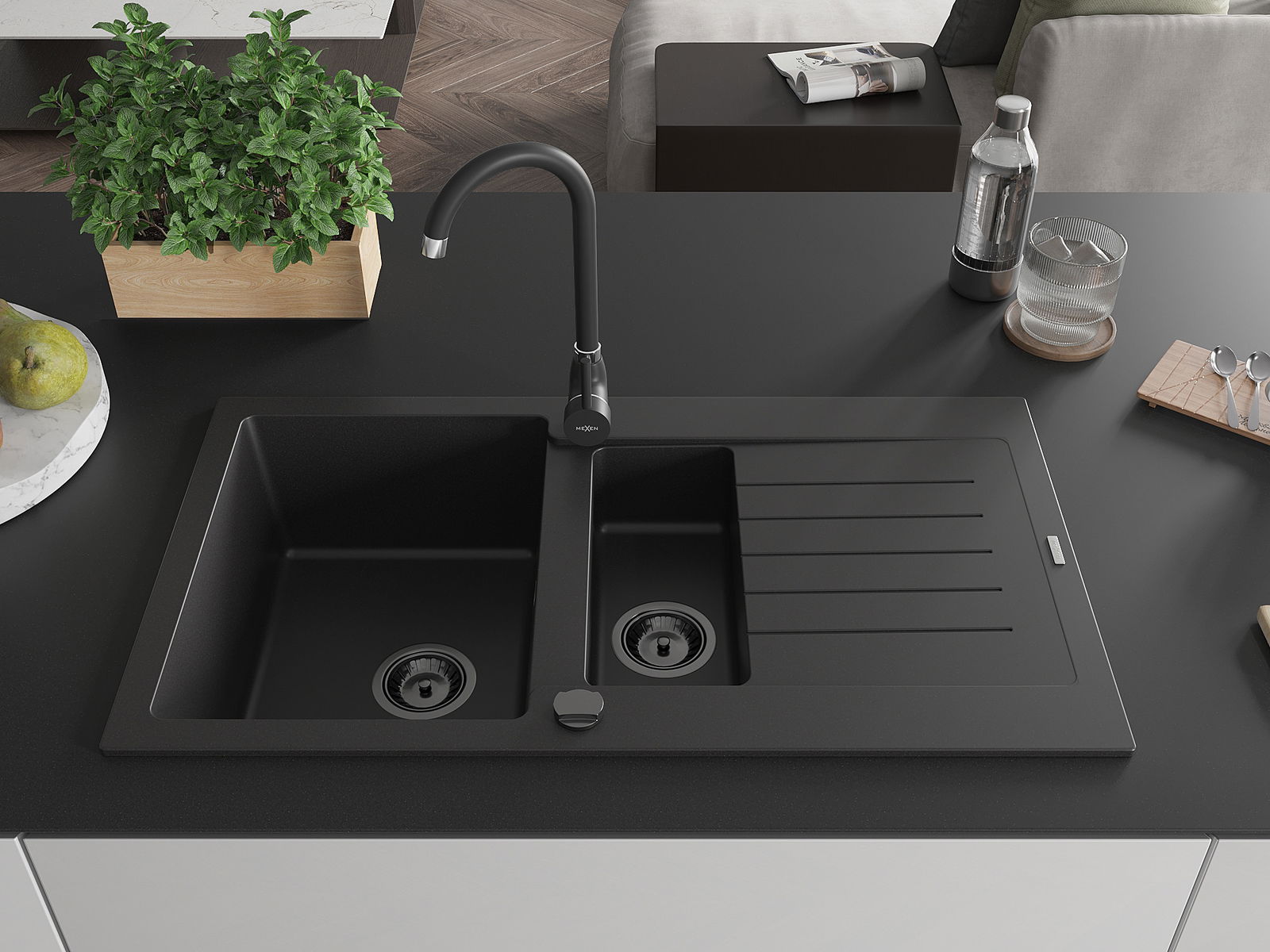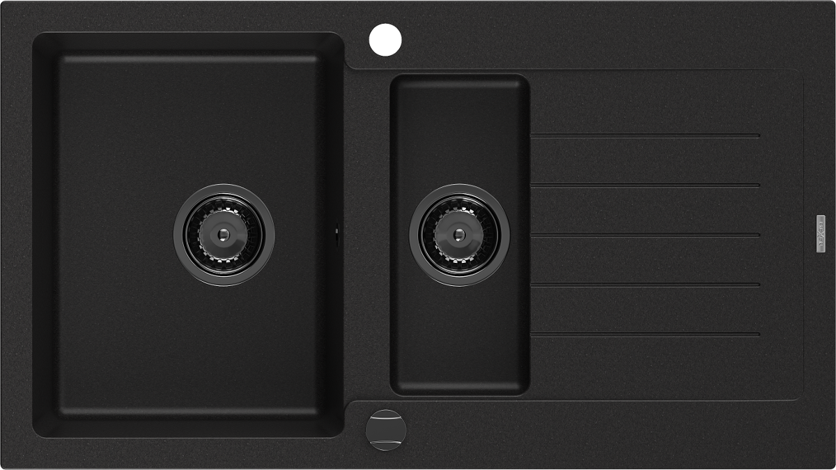 Mexen Matias granitový dřez 1,5-komorový s odkapávačem 900 x 505 mm, černý, černý sifon - 6502901505-77-B