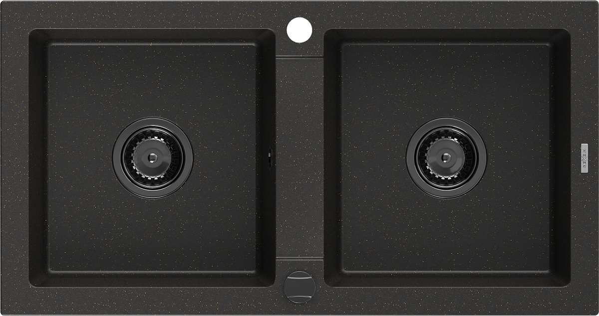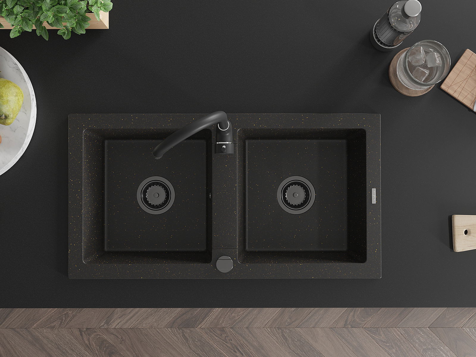 Mexen Mario granitový dřez 2-komorový 820 x 436 mm, černý/zlatý metalík, černý sifon - 6504822000-75-B