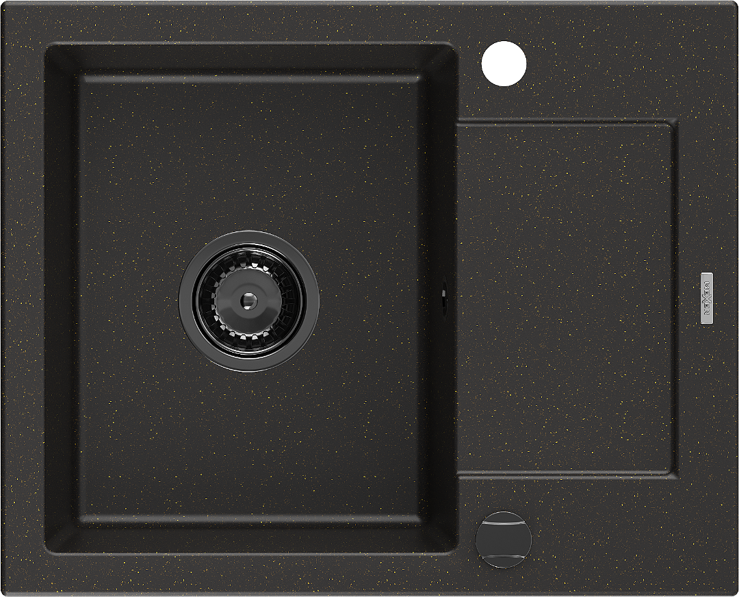 Mexen Enzo granitový dřez 1-komorový s odkapávačem 576 x 465 mm, černý/zlatý metalik, černý sifon - 6506571005-75-B