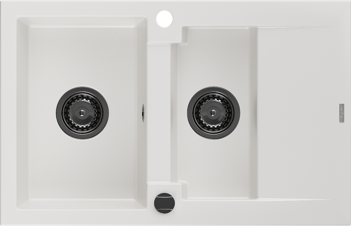 Mexen Gaspar granitový dřez 1,5-komorový s odkapávačem 737 x 475 mm, bílý, černý sifon - 6507731505-20-B