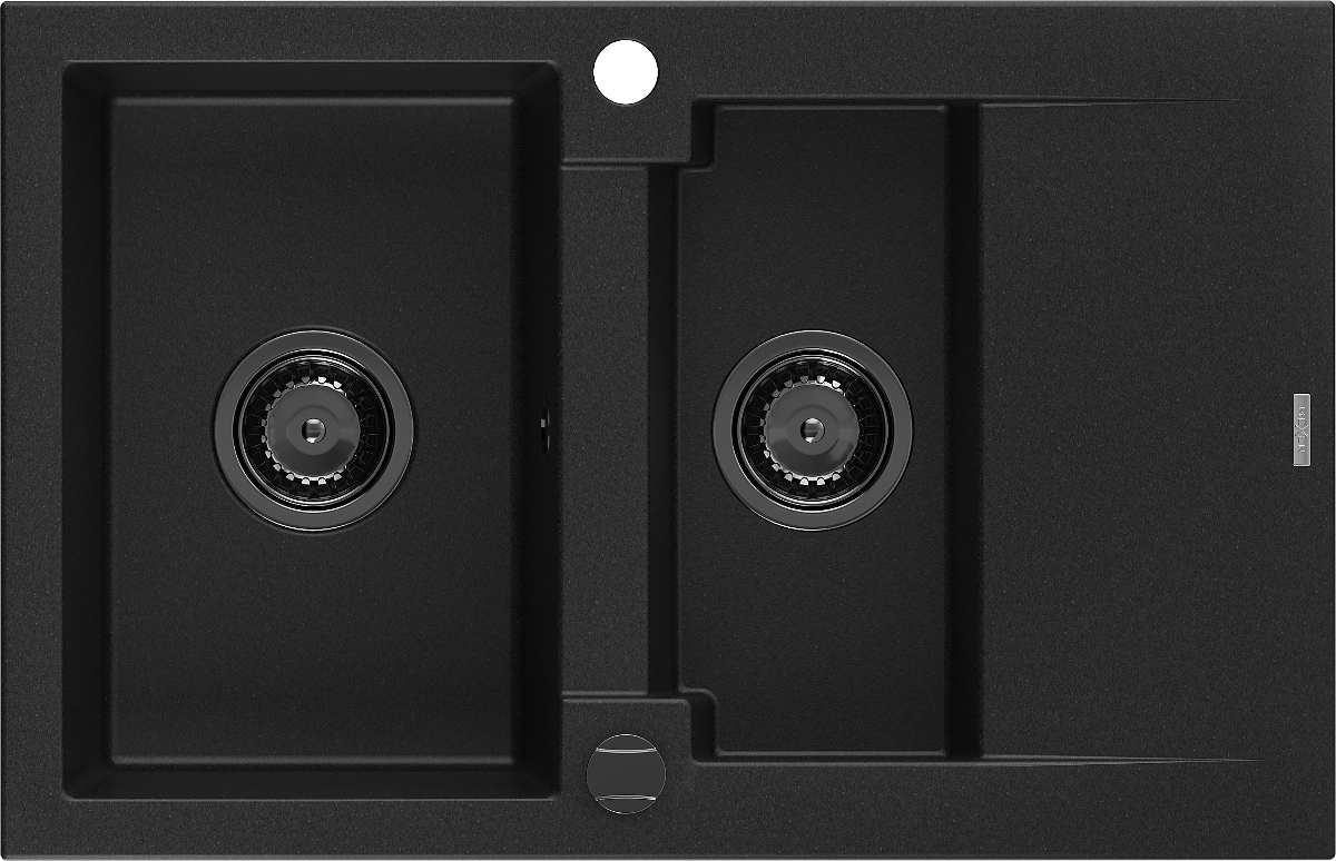 Mexen Gaspar žulový dřez 1,5-komorový s odkapávačem 737 x 475 mm, černý, černý sifon - 6507731505-77-B