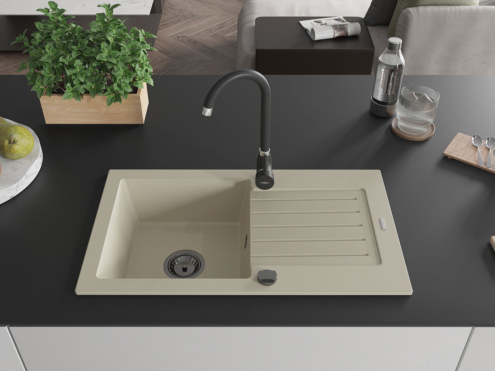 Mexen Pablo granitový dřez 1-komorový s odkapávačem 752 x 436 mm, béžový, sifon černý - 6510751010-69-B