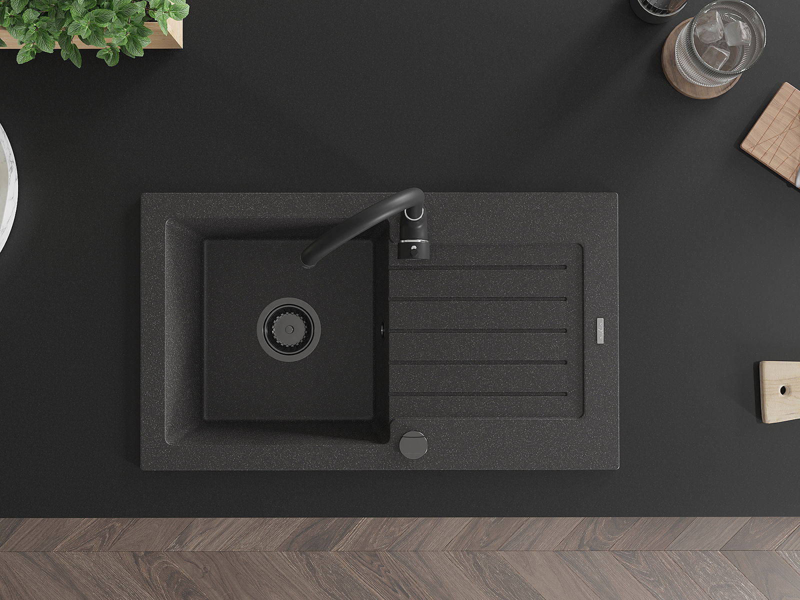 Mexen Pablo žulový kuchyňský dřez 1-komorový s odkapávačem 752 x 436 mm, černý skvrnitý, černý sifon - 6510751010-76-B
