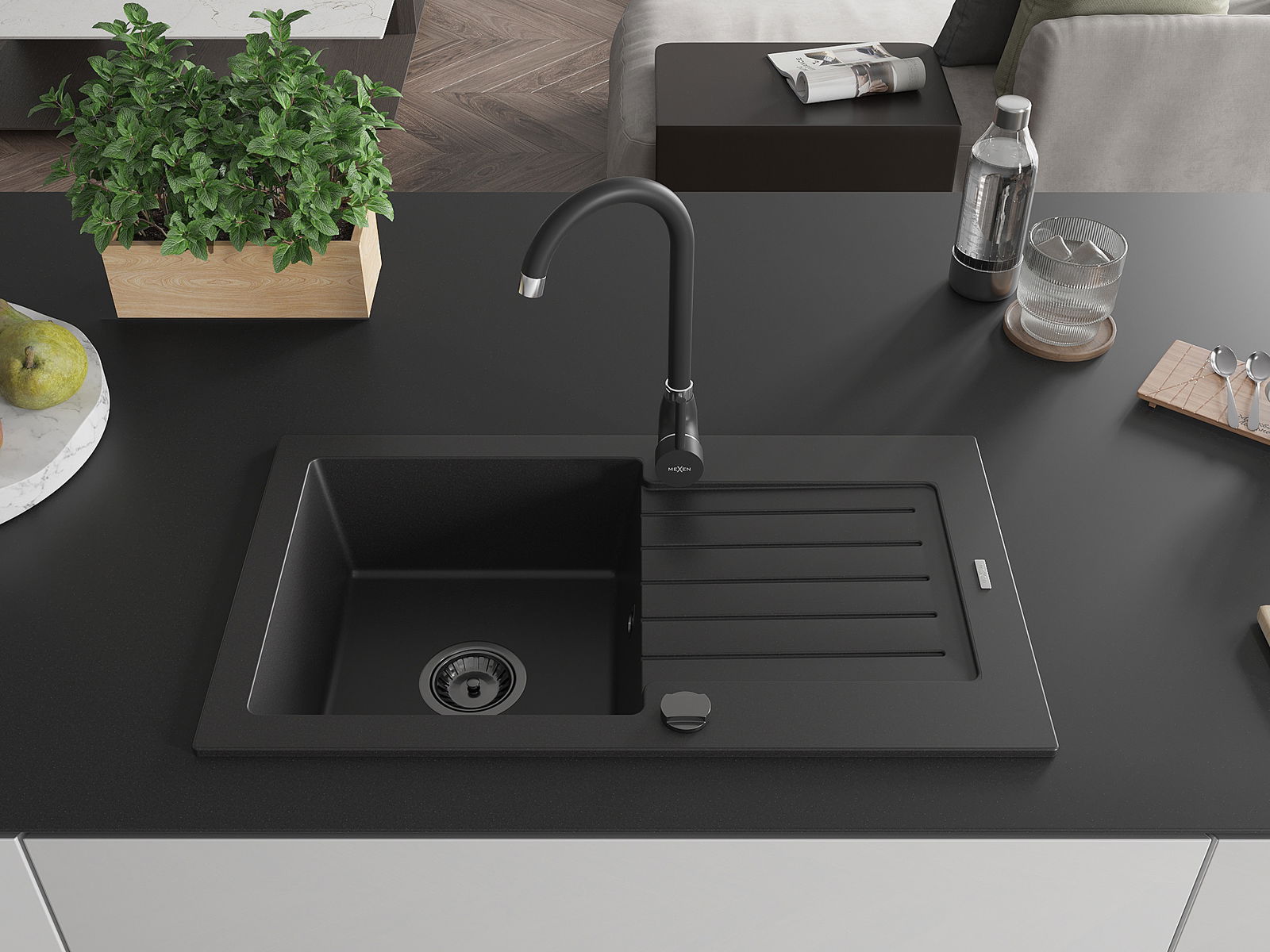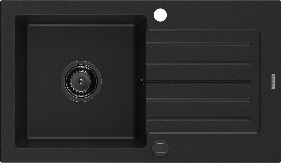 Mexen Pablo jednorázový granitový dřez s odkapávačem 752 x 436 mm, černý, černý sifon - 6510751010-77-B