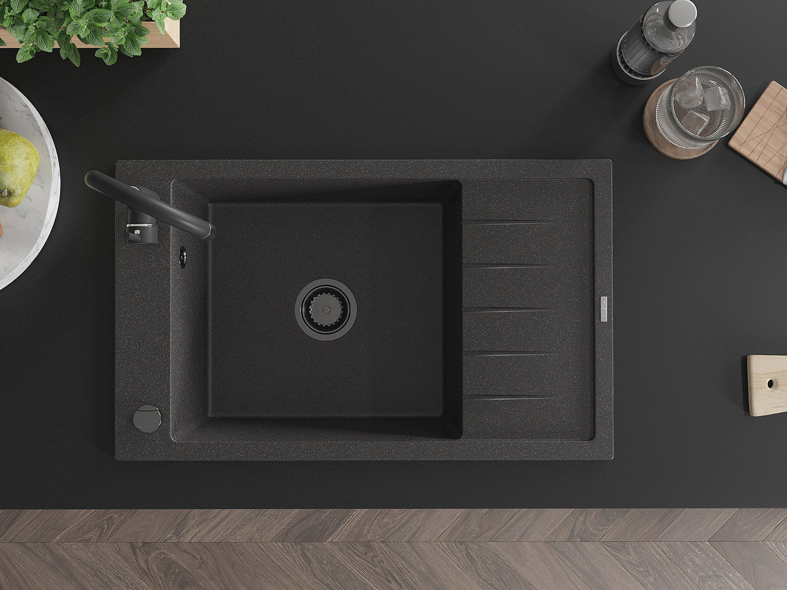 Mexen Elias granitový kuchyňský dřez s odkapávačem 795 x 480 mm, černý skvrnitý, černý sifon - 6511791005-76-B