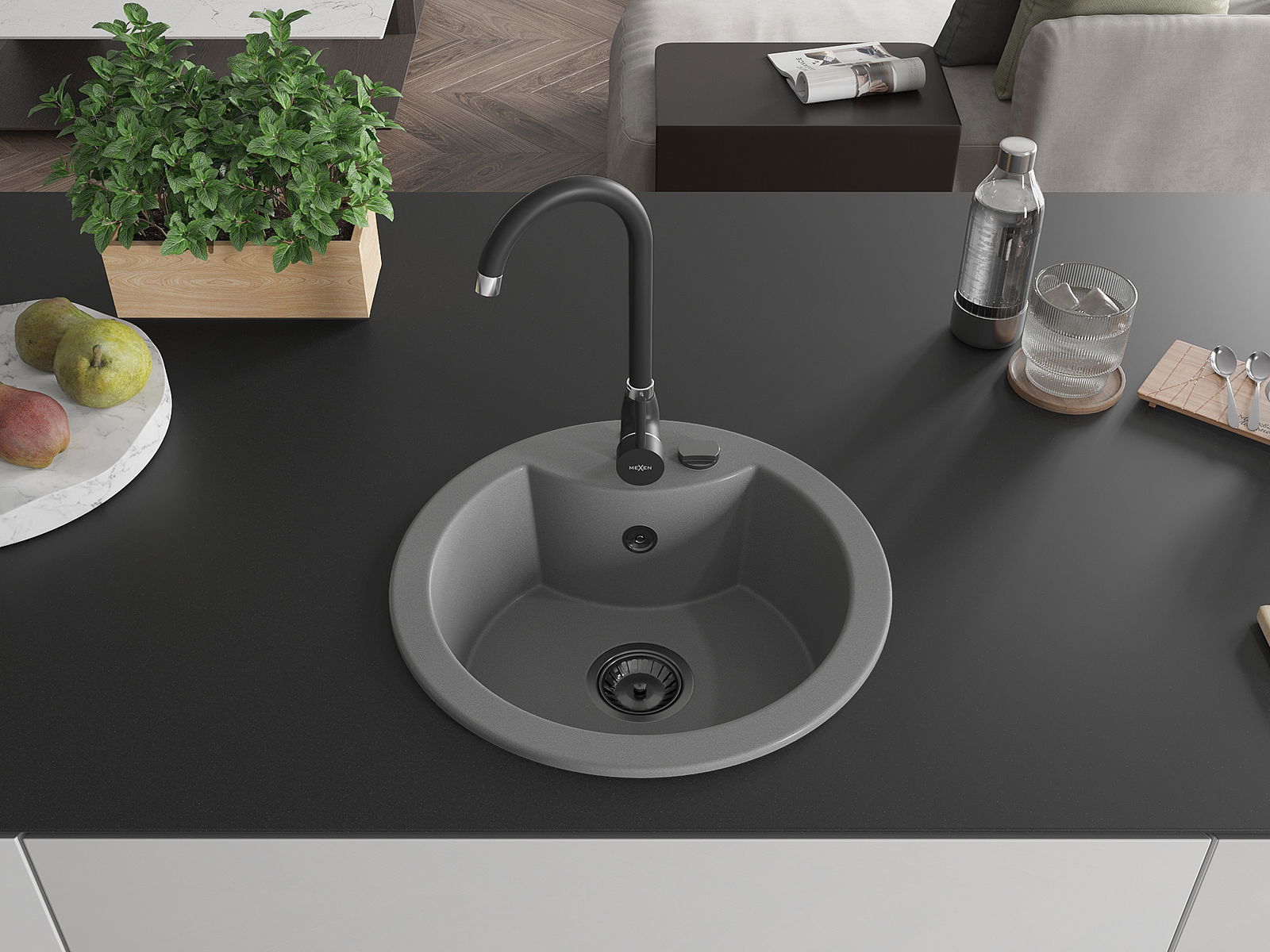 Mexen Diego granitový dřez 1-komorový 488 x 480 mm, šedý, černý sifon - 6512481000-71-B