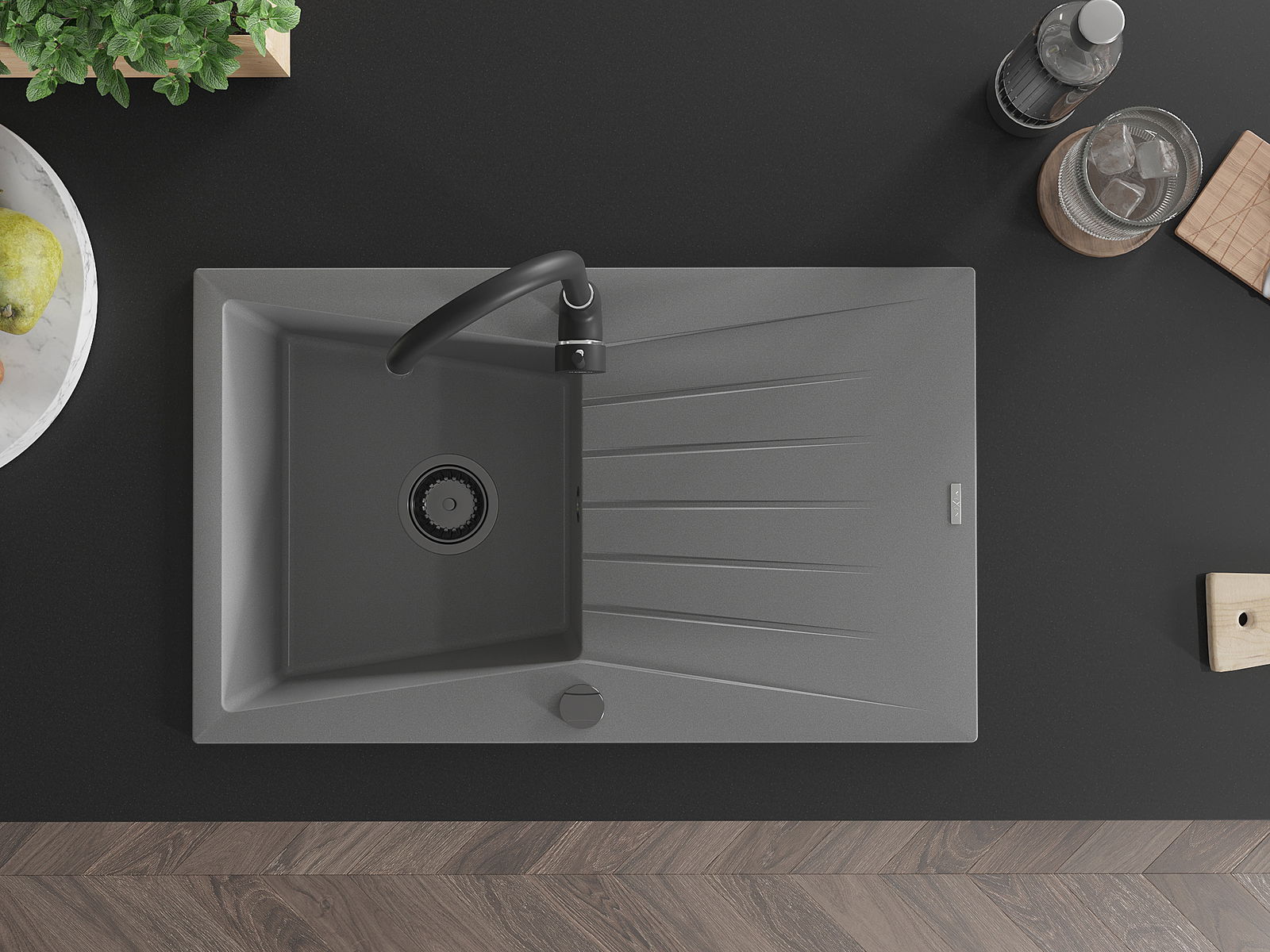 Mexen Cesar granitový dřez 1-komorový s odkapávačem 775 x 470 mm, šedý, sifon černý - 6514771010-71-B