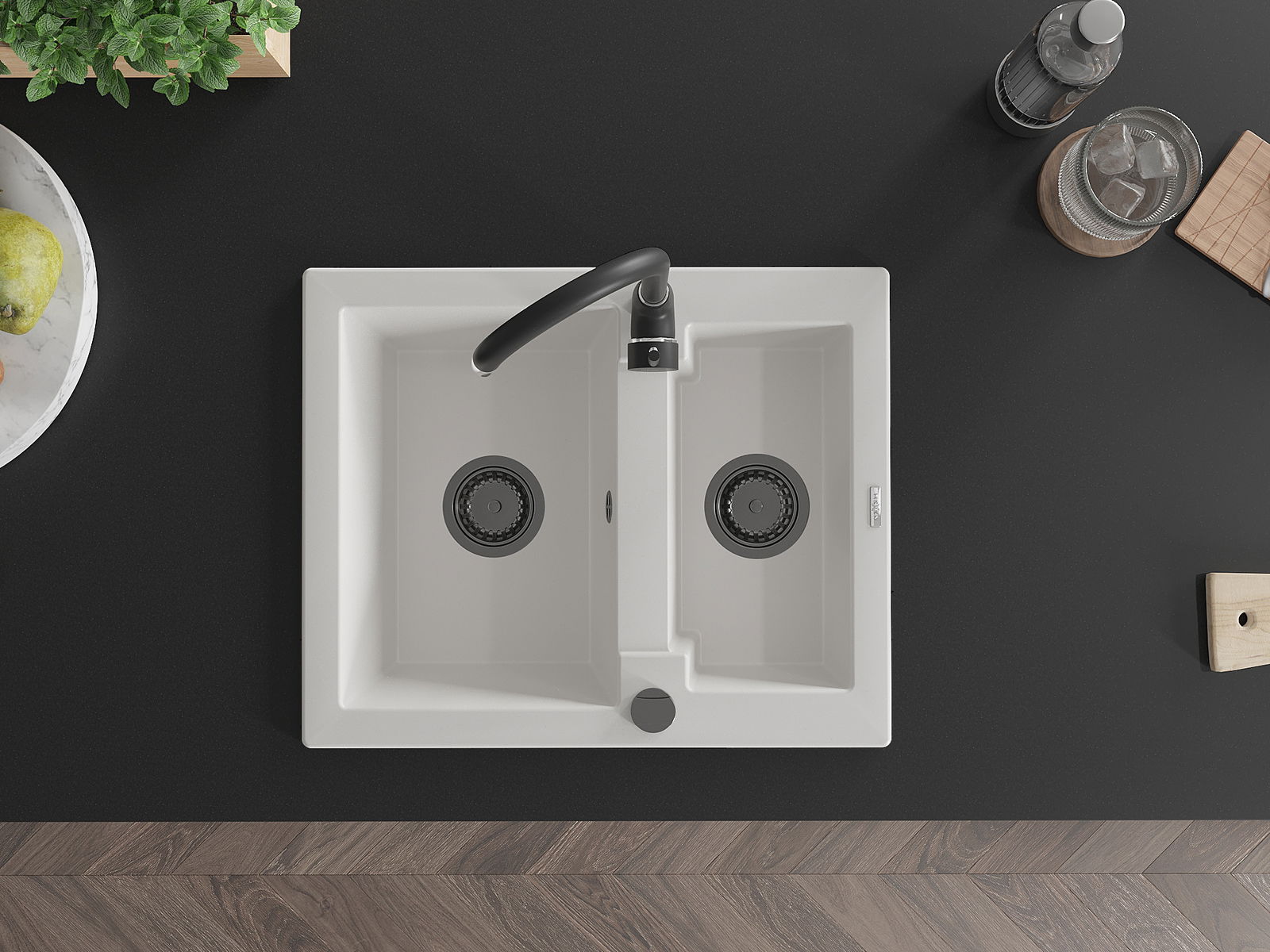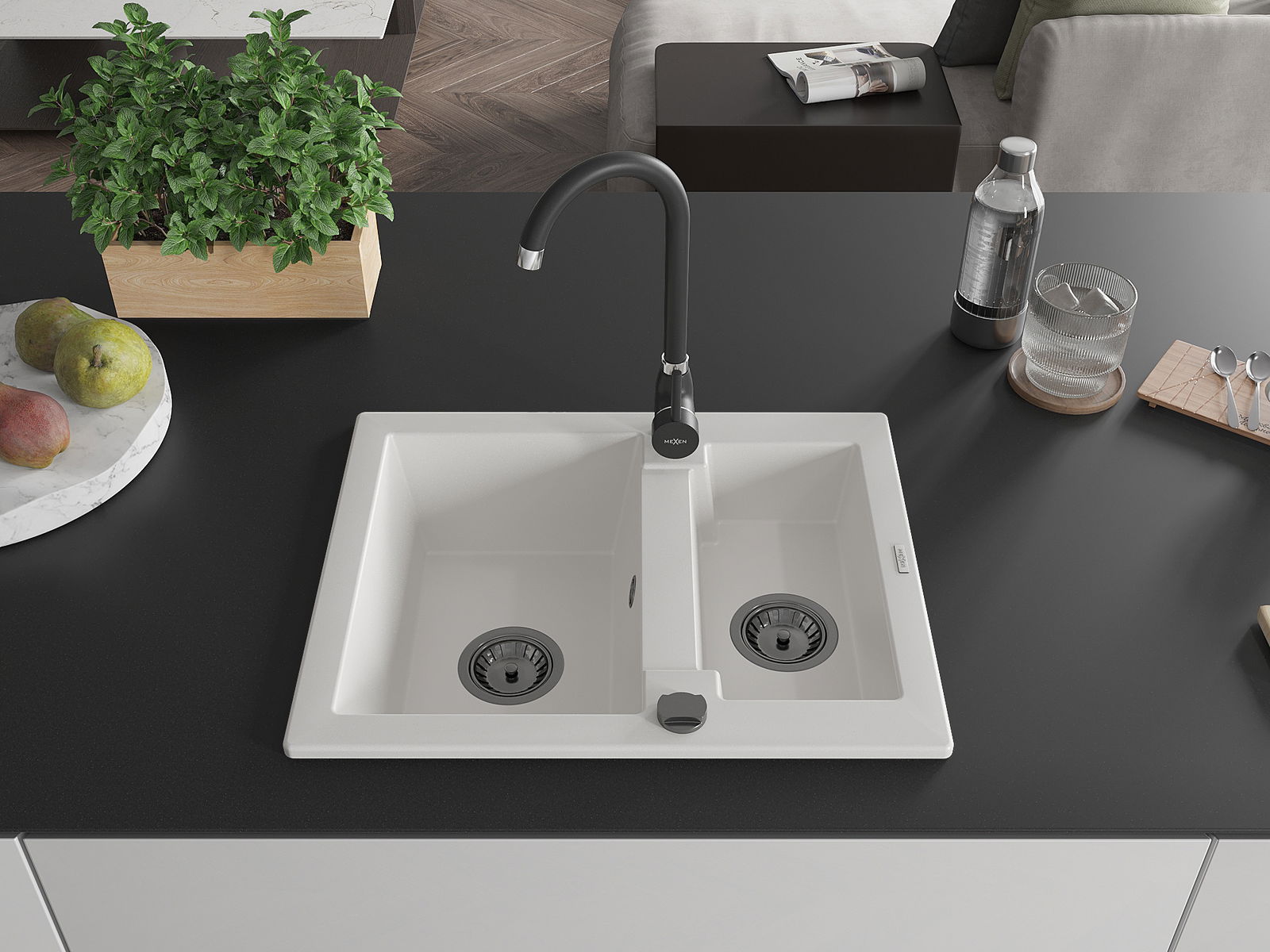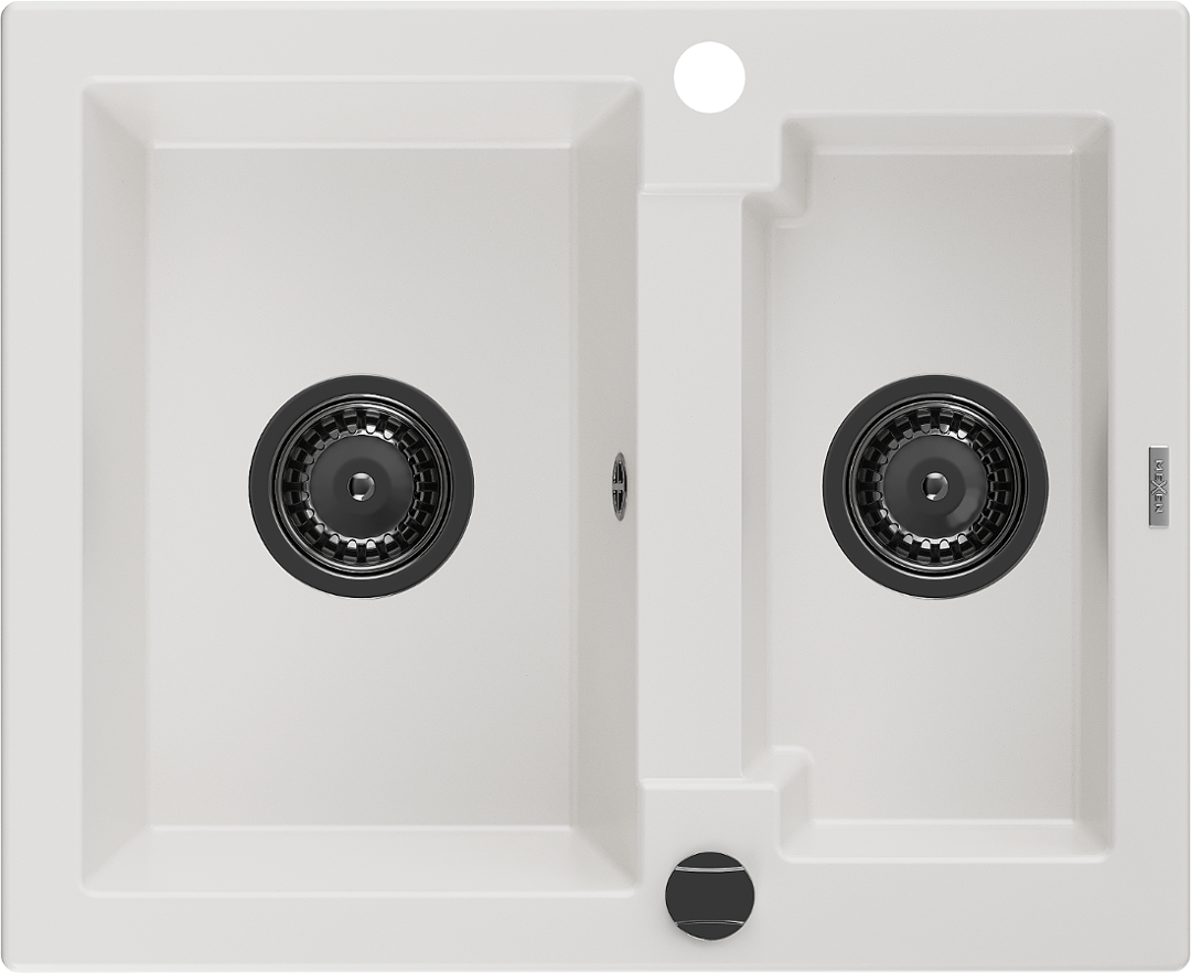 Mexen Carlos žulový dřez 1,5-komorový 582 x 475 mm, bílý, černý sifon - 6518581500-20-B