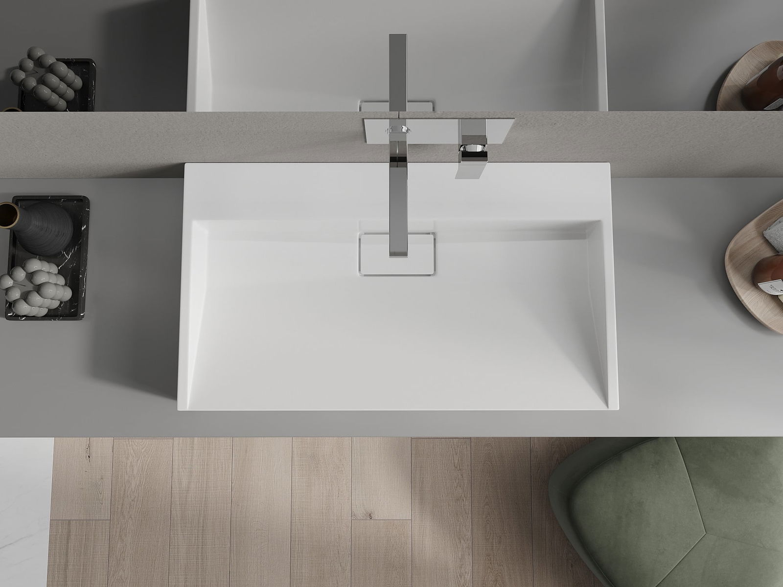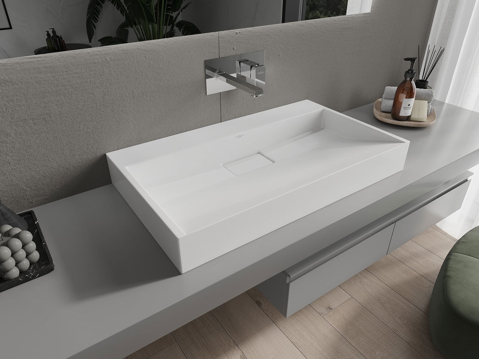 Umyvadlo na desku z konglomerátu o rozměrech 80 x 46 cm, v bílé barvě, je ideálním řešením pro moderní koupelny. Díky své obdélníkové formě a specializované konstrukci produkt dokonale zapadá do designových trendů a zároveň nabízí funkčnost. Nízká výška 11 cm zajišťuje, že umyvadlo je pohodlné k použití. Konglomerátový materiál zaručuje trvanlivost a snadnou údržbu. Absence otvorů na baterii umožňuje větší svobodu při výběru armatury.