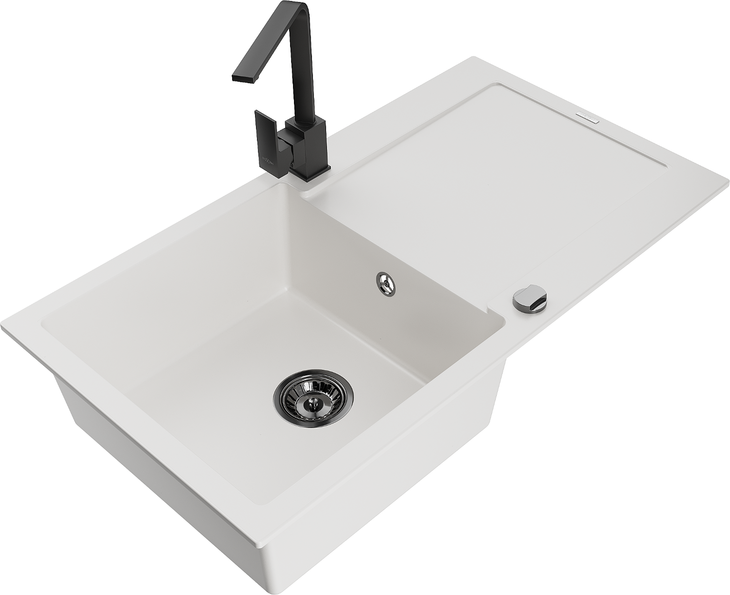 Mexen Leo granitový dřez 1-komorový s odkapávačem a kuchyňskou baterií Rita, bílý - 6501-20-670300-70