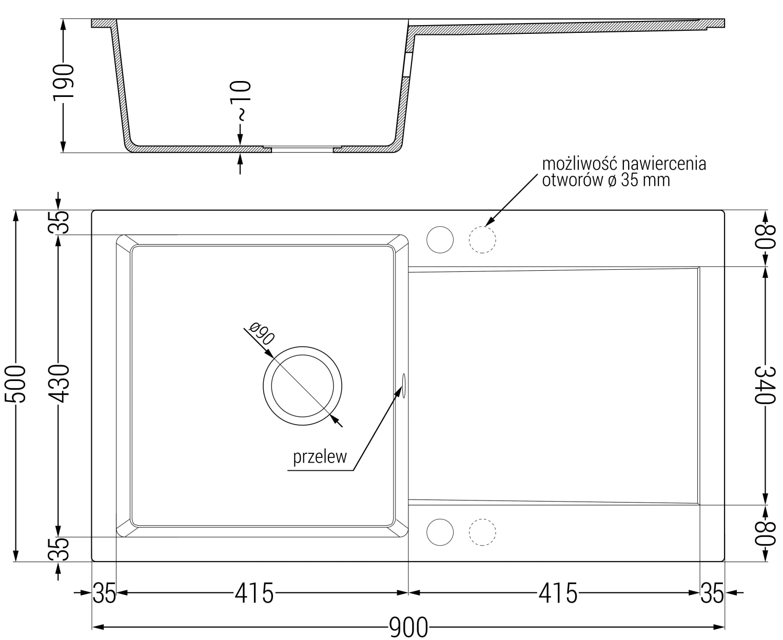Dřez má 2 předvrtané otvory o průměru 35 mm, které lze samostatně vyrazit. Mohou být použity mimo jiné k montáži dávkovače tekutin, který eliminuje přítomnost plastových lahví v kuchyni a dodá jí elegantní vzhled.