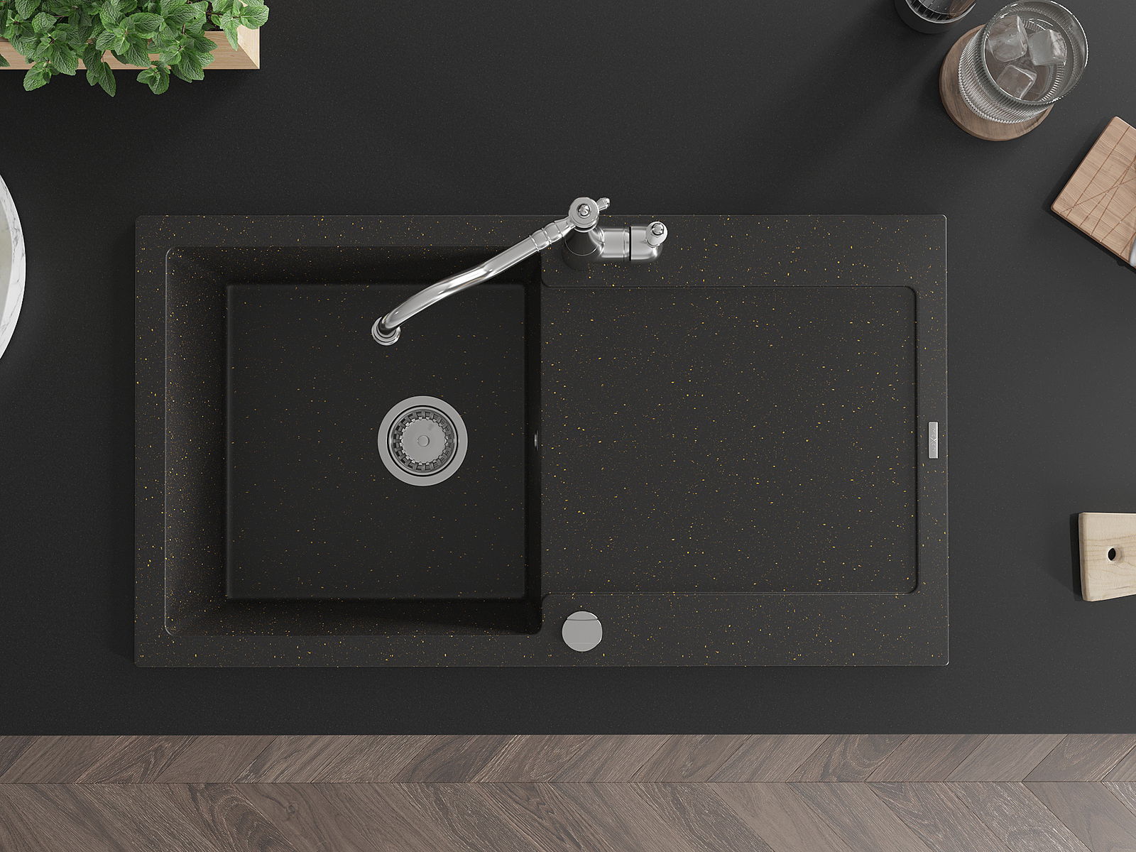 Mexen Leo granitový dřez s 1 komorou a odkapávačem a kuchyňskou baterií Carla, černá/zlatý metalík - 6501-75-670700-00