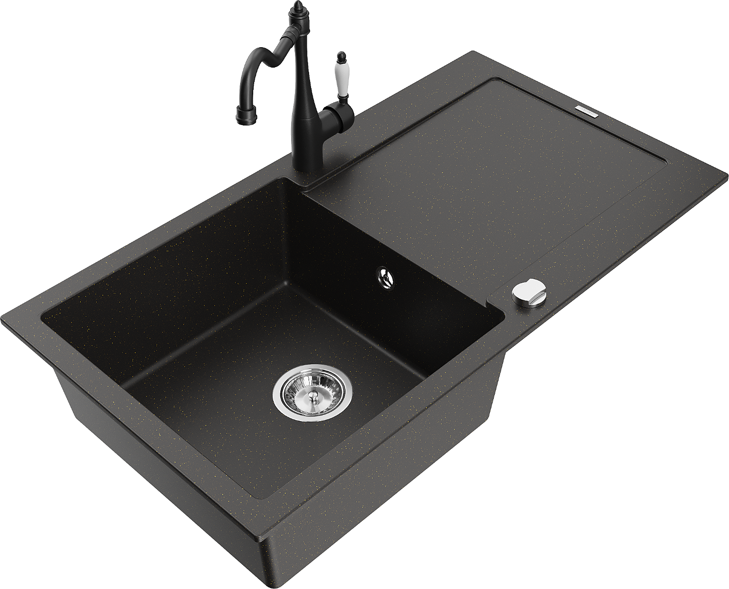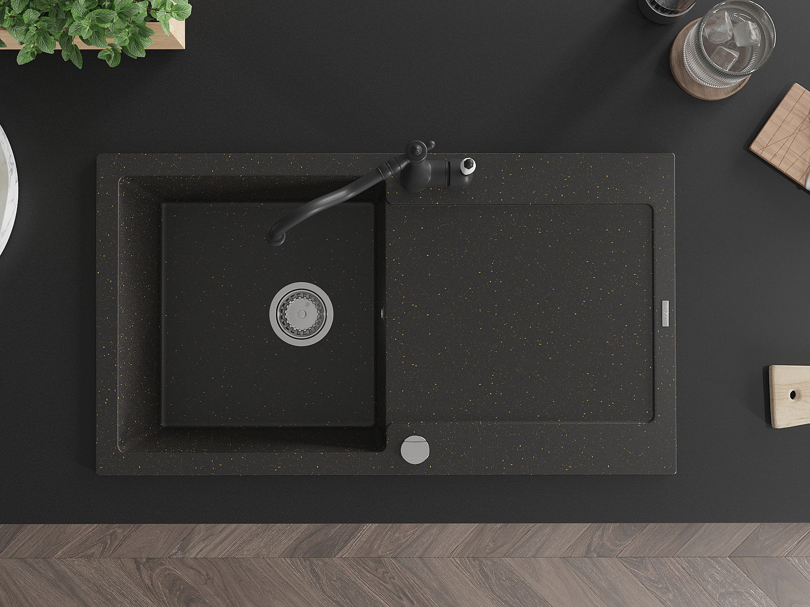 Mexen Leo granitový dřez s 1 komorou, odkapávačem a kuchyňskou baterií Carla, černý/zlatý metalik - 6501-75-670700-70
