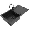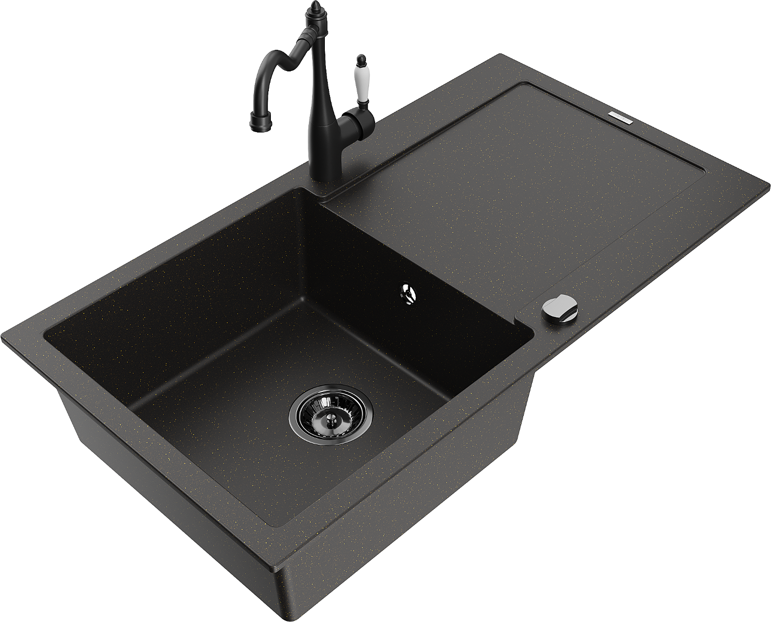 Mexen Leo granitový dřez 1-komorový s odkapávačem a kuchyňskou baterií Carla, černý/zlatý metalík - 6501-75-670700-70-B