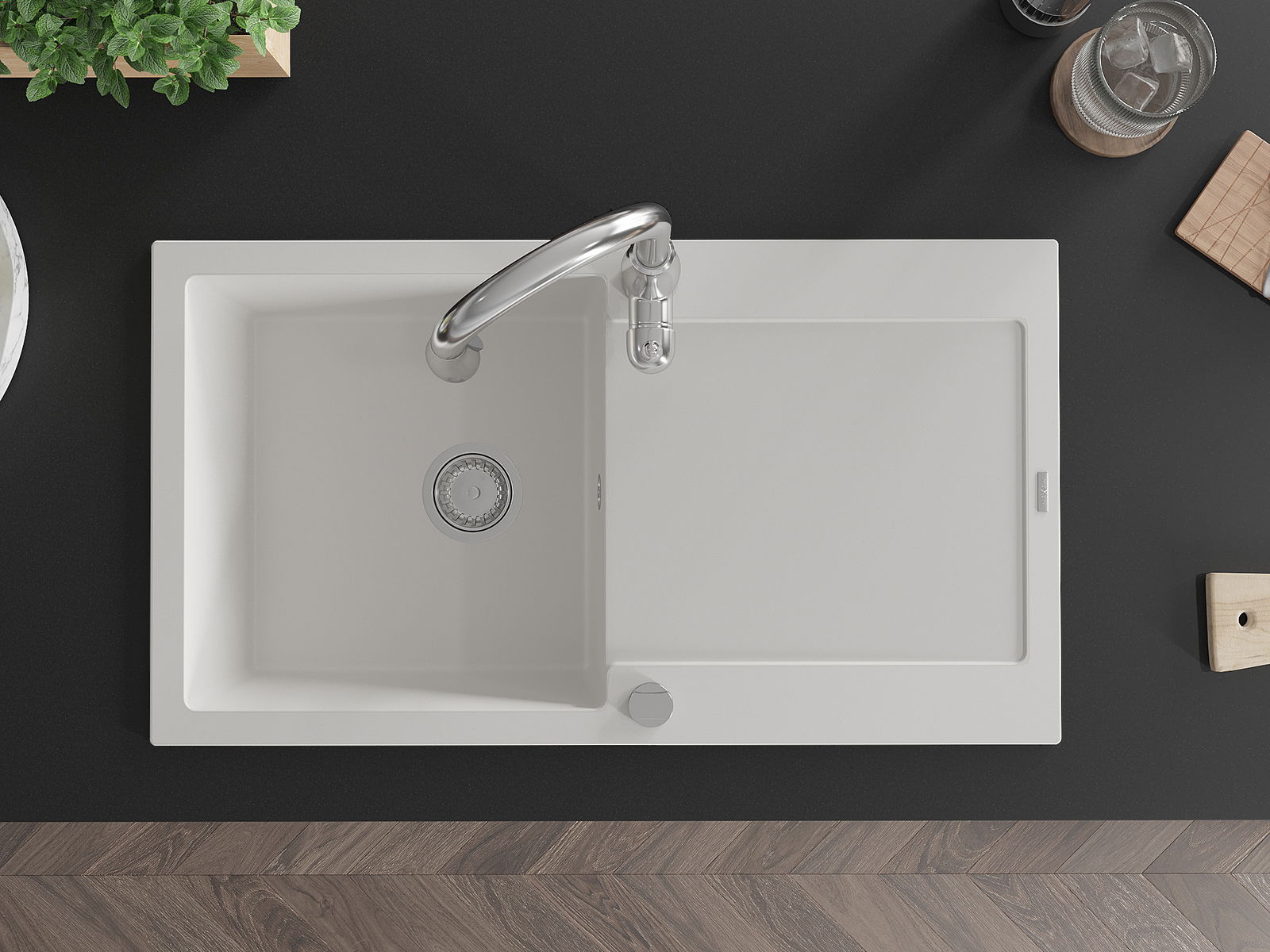 Povrch dřezu je odolný proti skvrnám a zabarvení, což usnadňuje jeho čištění a zachovává jeho barvu po dlouhou dobu používání. Estetický a praktický doplněk každé kuchyně.