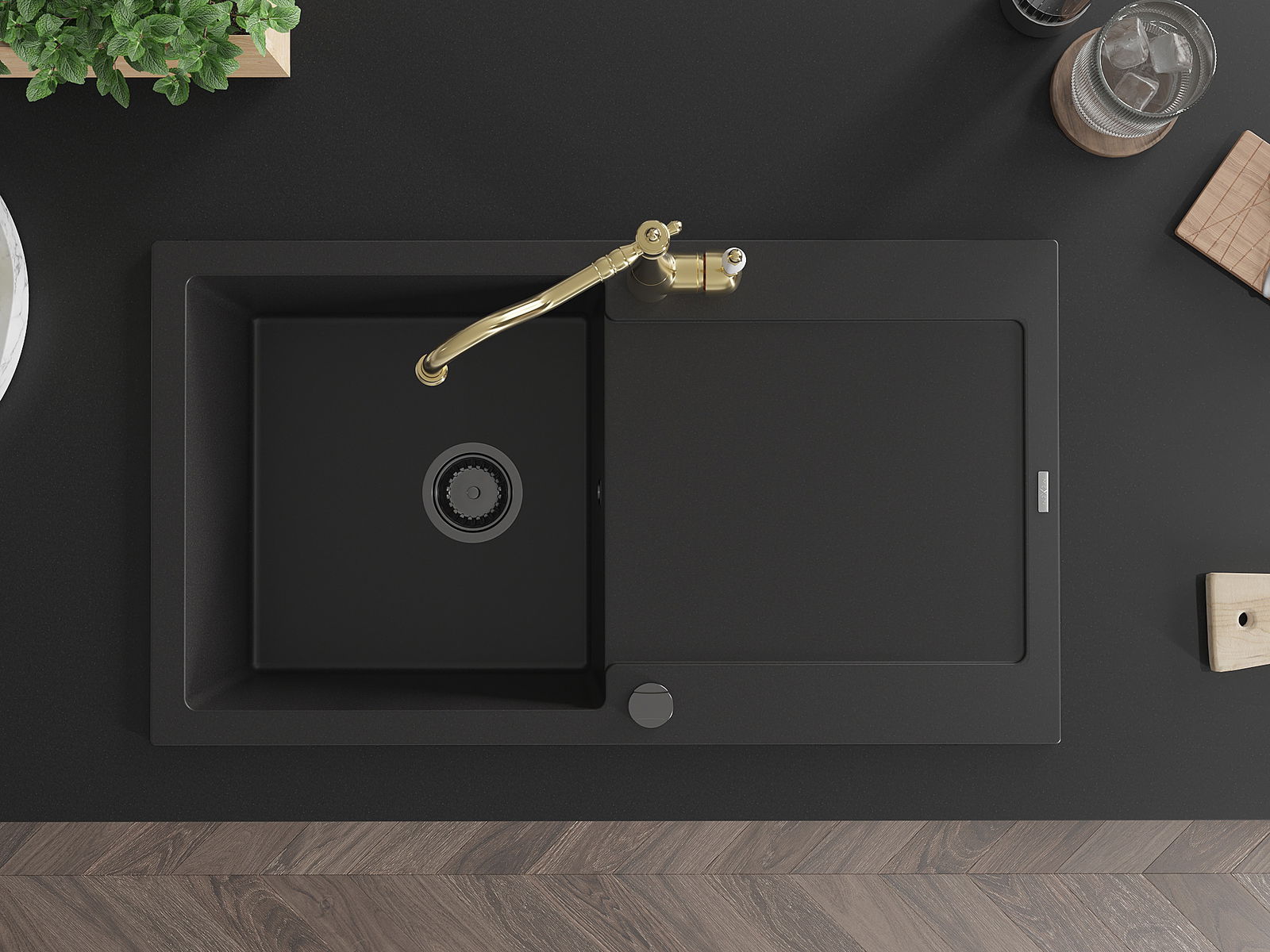 Mexen Leo granitový dřez 1-komorový s odkapávačem a kuchyňskou baterií Carla, černý - 6501-77-670700-50-B