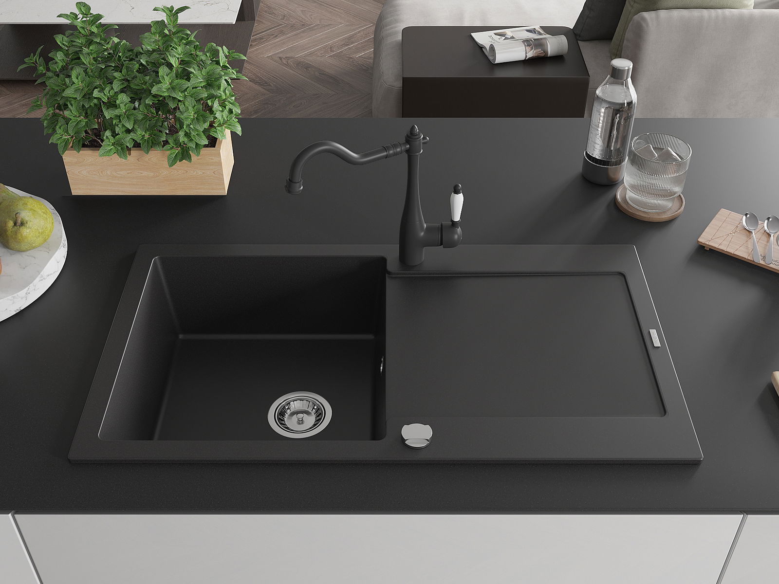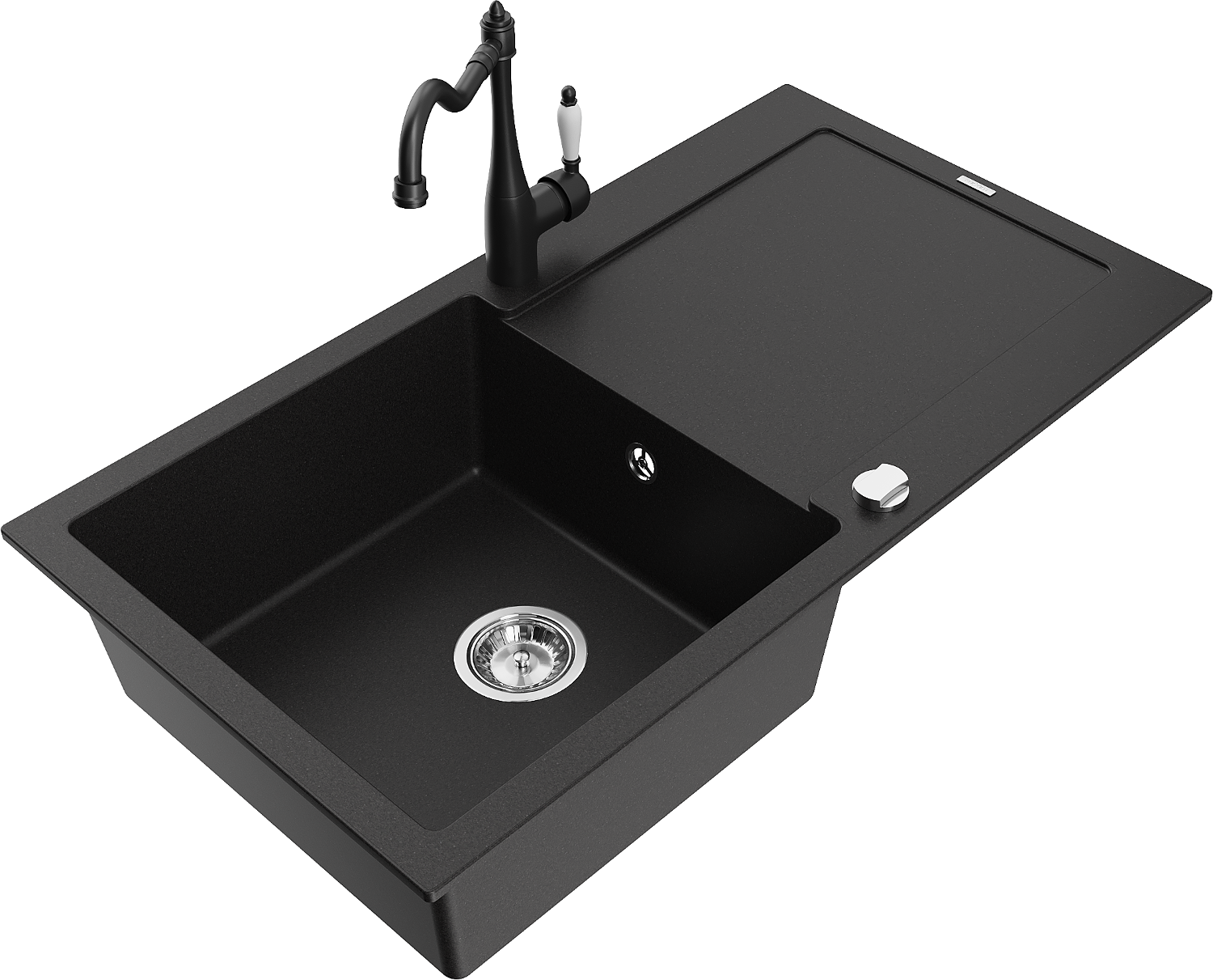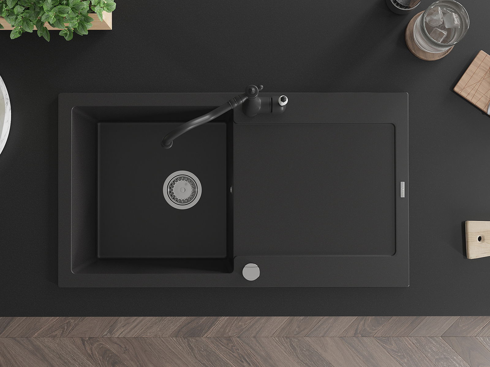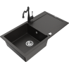 Mexen Leo granitový dřez 1-komorový s odkapávačem a kuchyňskou baterií Carla, černý - 6501-77-670700-70