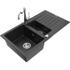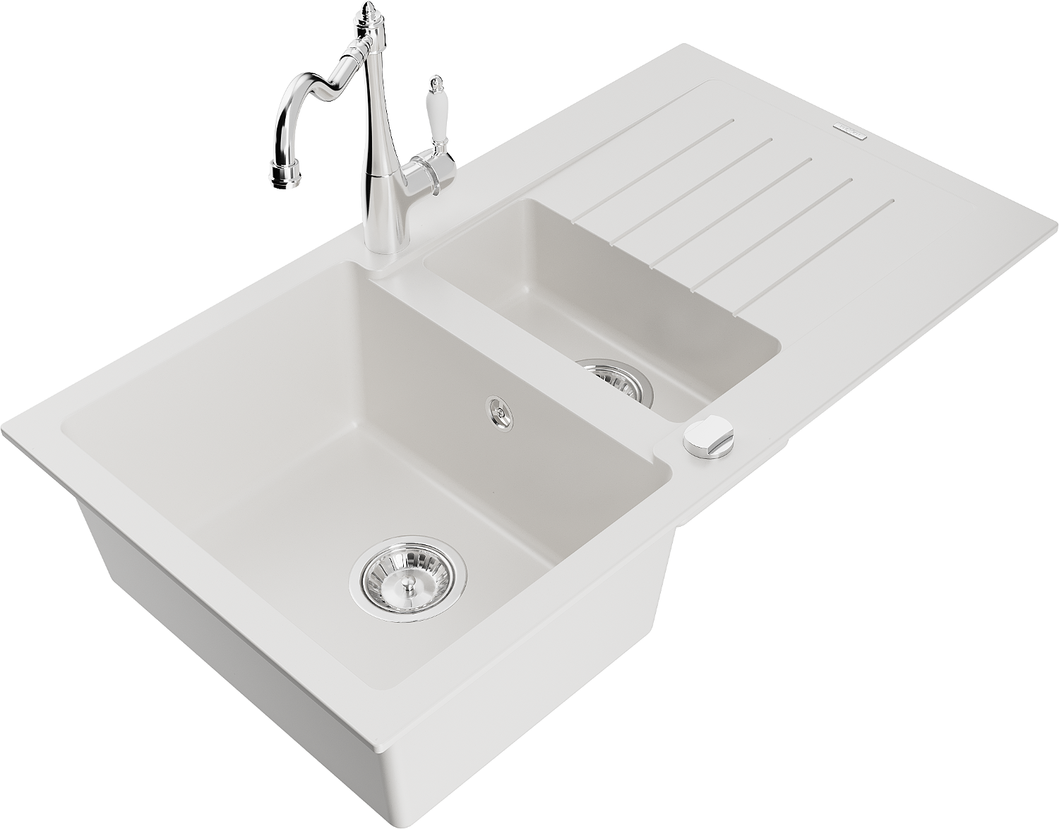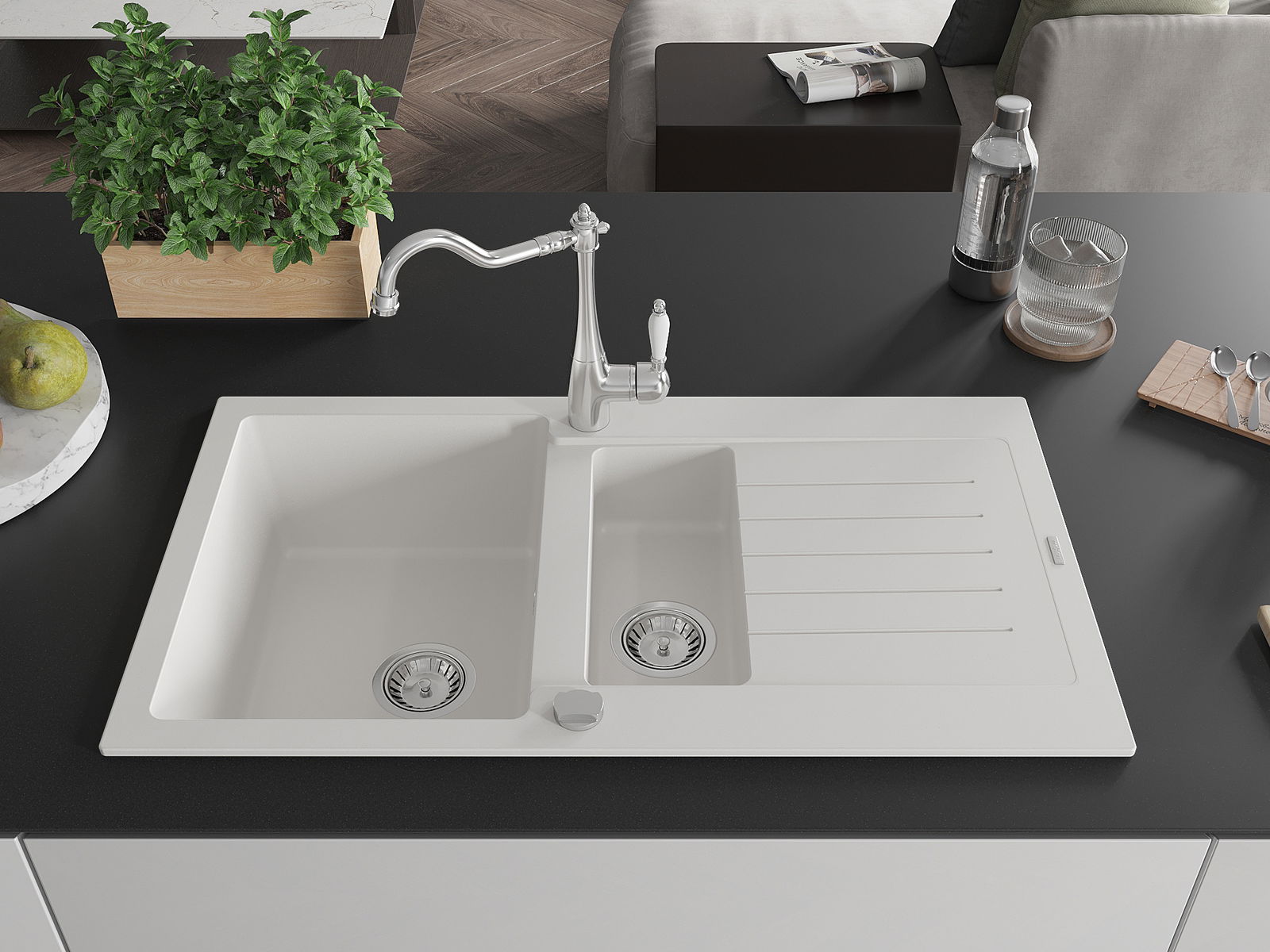 Mexen Matias granitový dřez 1,5-komorovy s odkapávací plochou a kuchyňskou baterií Carla, bílý - 6502-20-670700-00