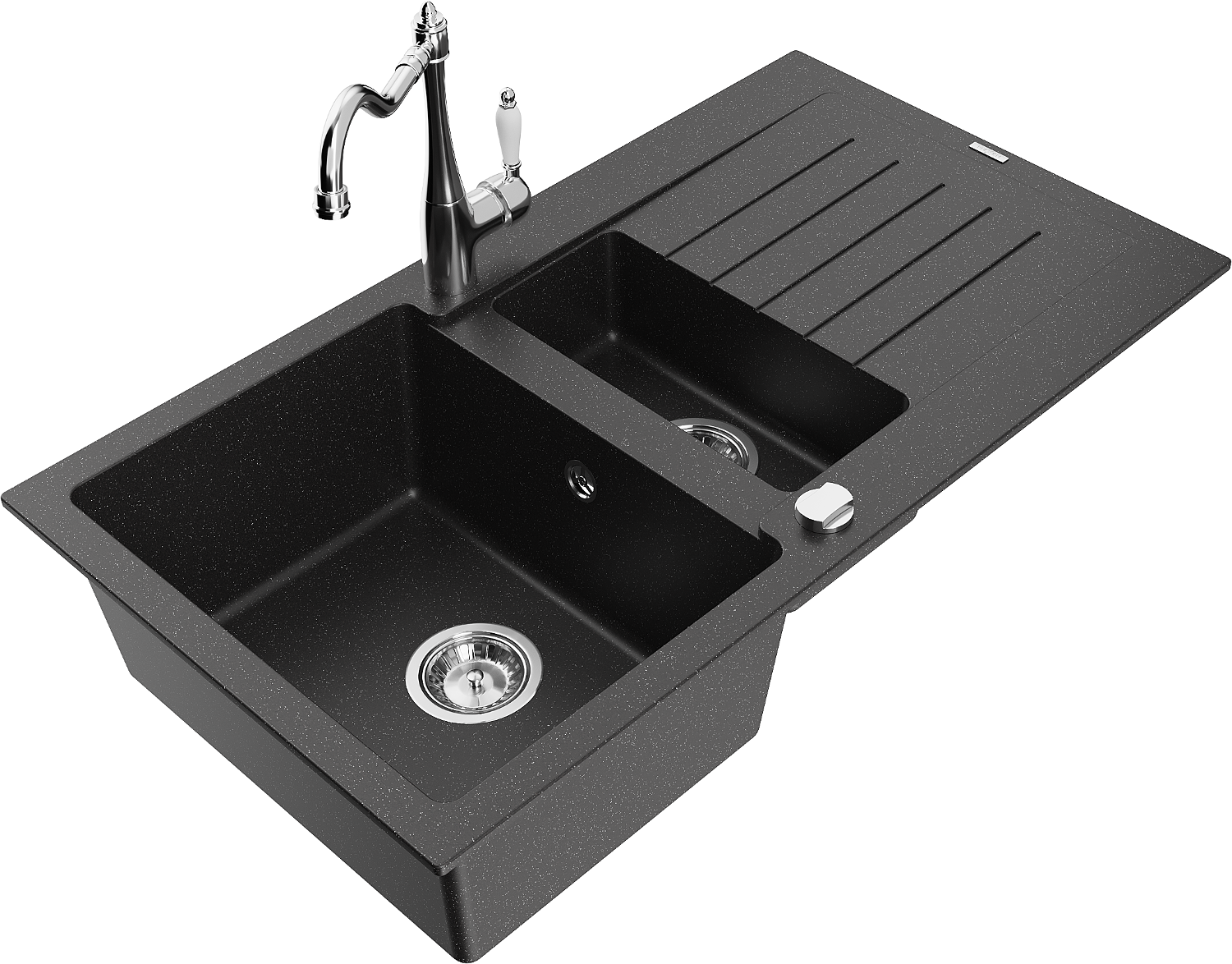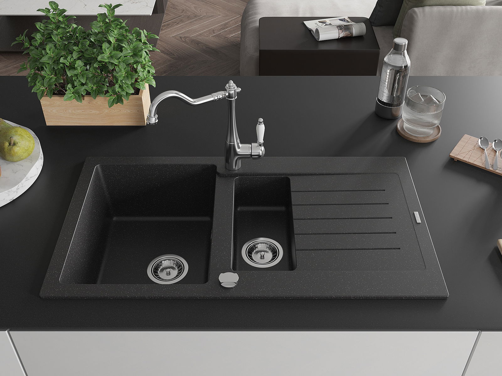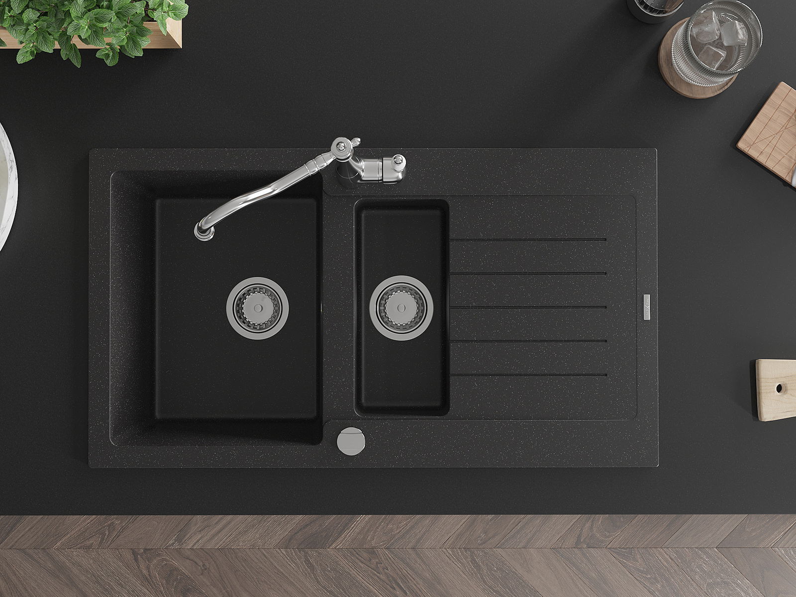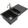 Mexen Matias granitový dřez 1,5-komorový s odkapávačem a kuchyňskou baterií Carla černý/stříbrný metalik - 6502-73-670700-00
