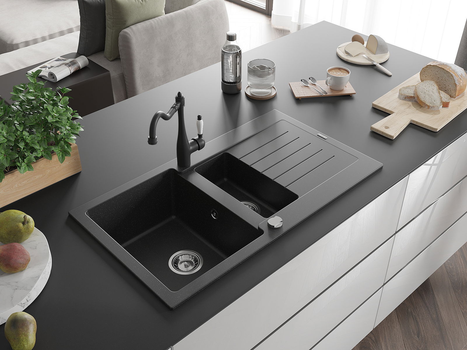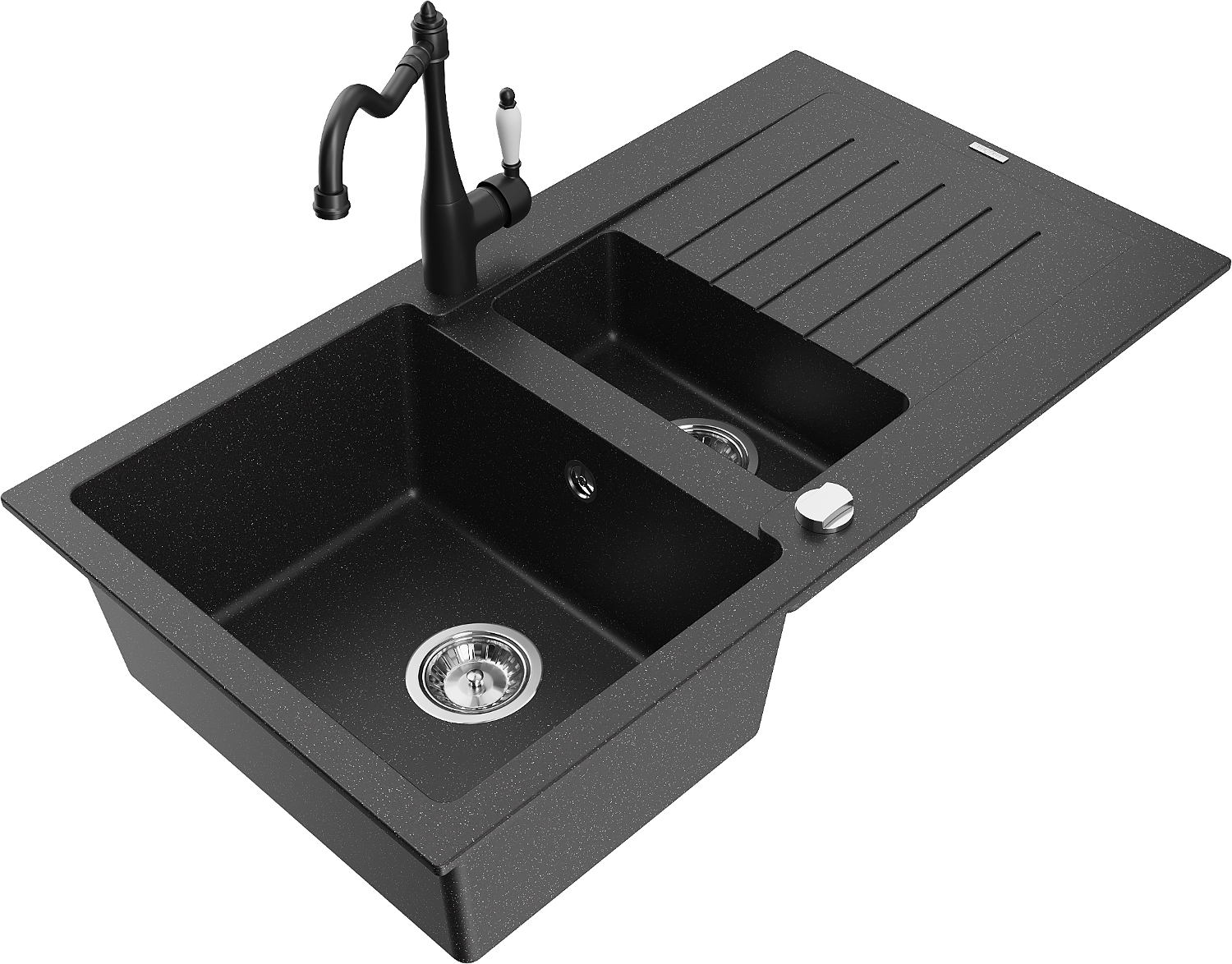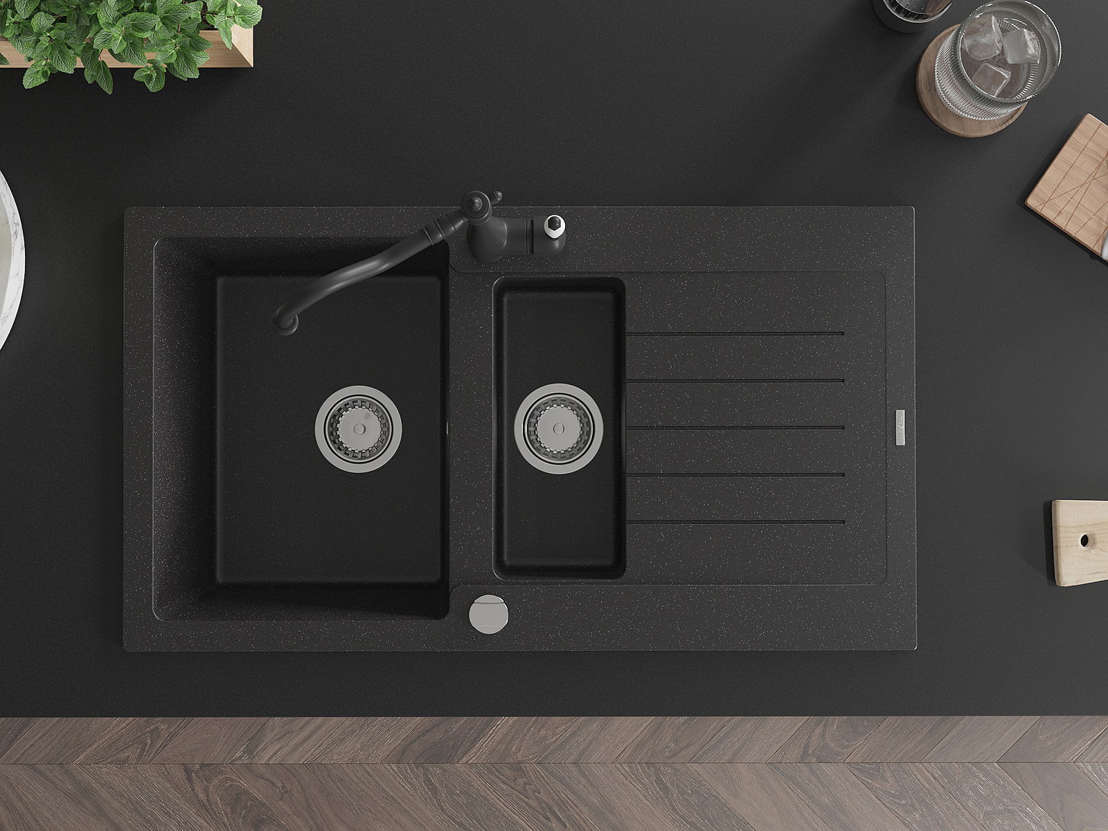 Mexen Matias granitový dřez 1,5-komorový s odkapávačem a kuchyňskou baterií Carla černý/stříbrný metalický - 6502-73-670700-70