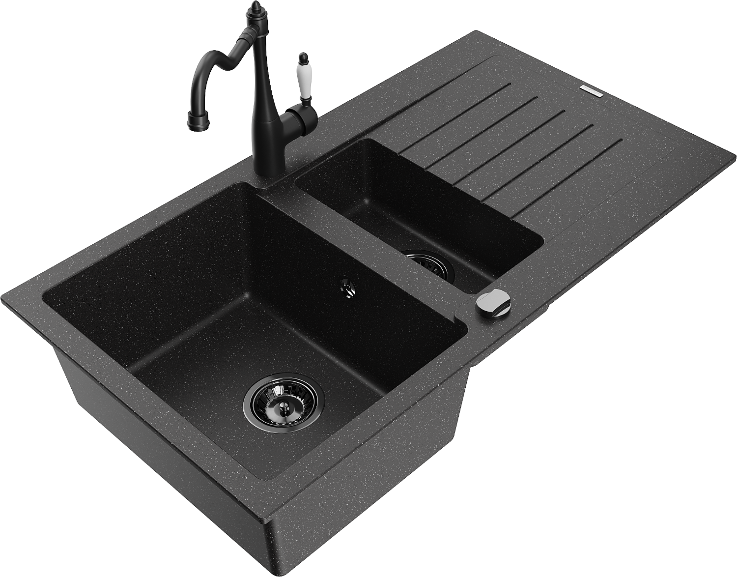 Mexen Matias granitový dřez 1,5-komorový s odkapávačem a kuchyňská baterie Carla, černý/stříbrný - 6502-73-670700-70-B