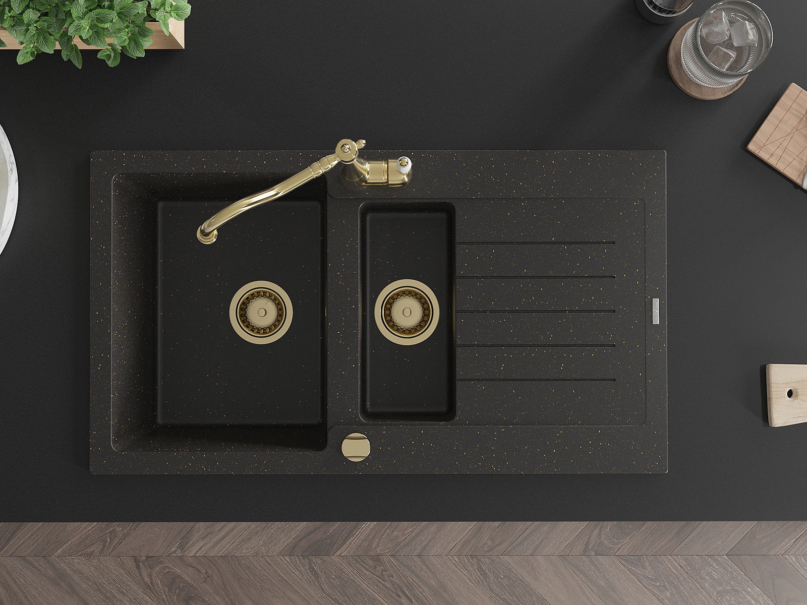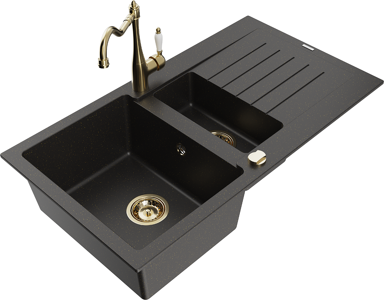 Mexen Matias granitový dřez 1,5-komorový s odkapávačem a kuchyňskou baterií Carla, černý/zlatý metalik - 6502-75-670700-50