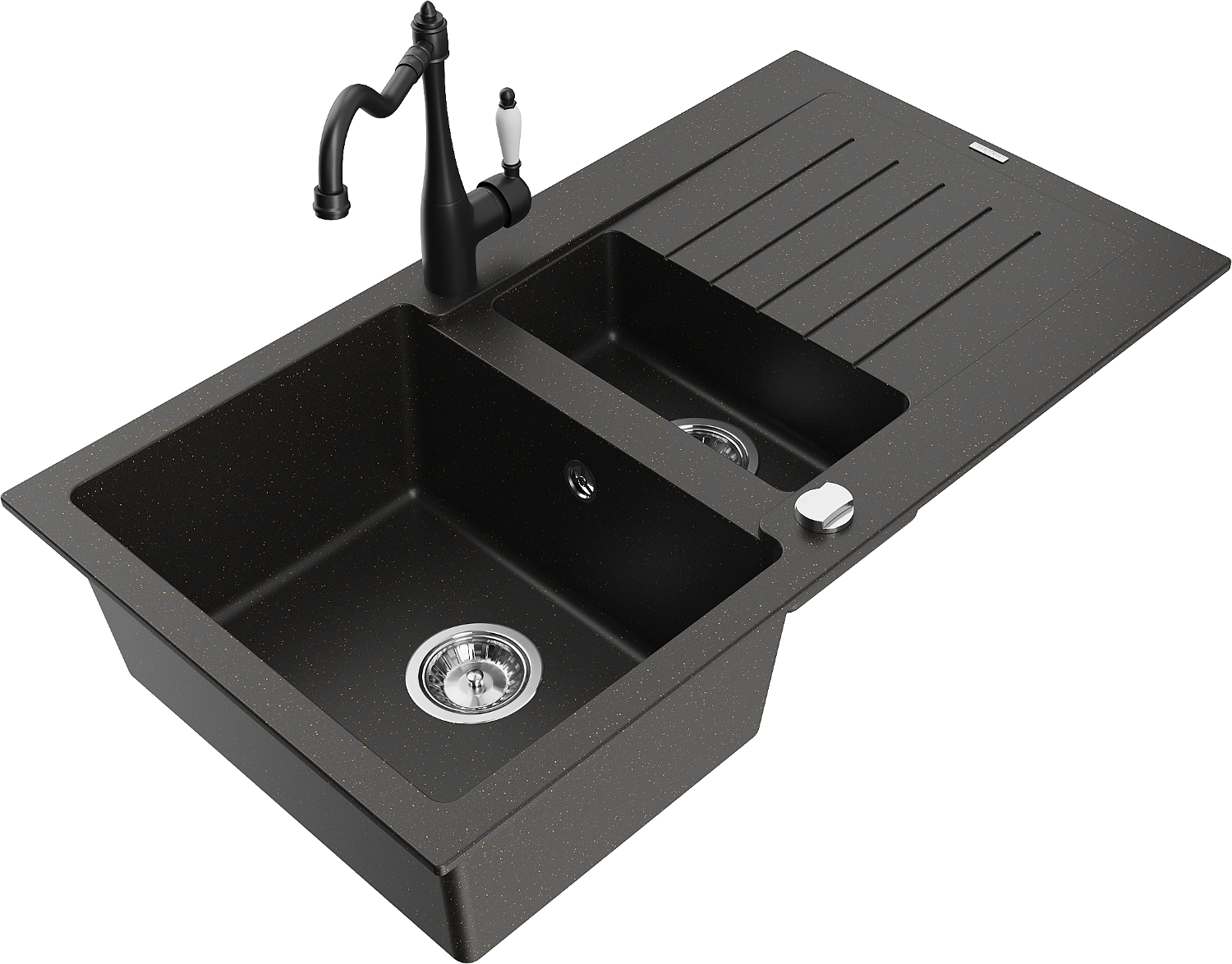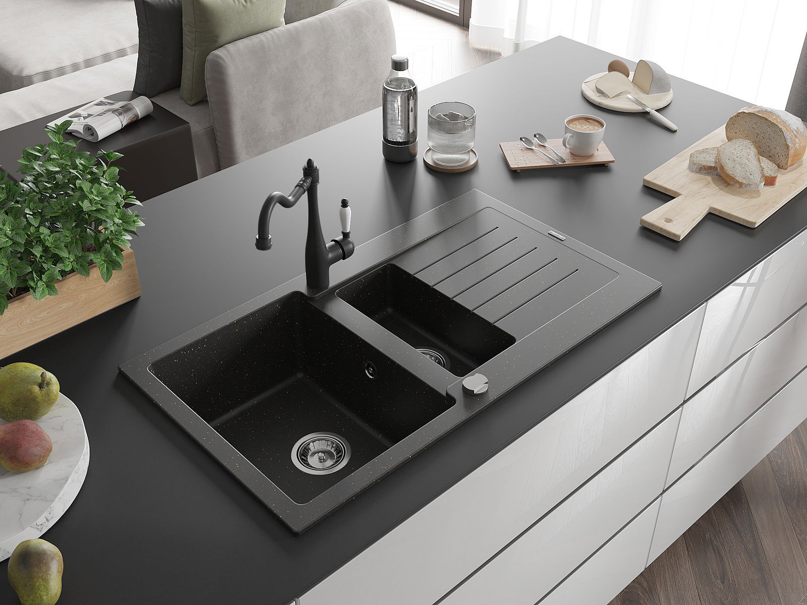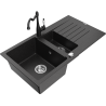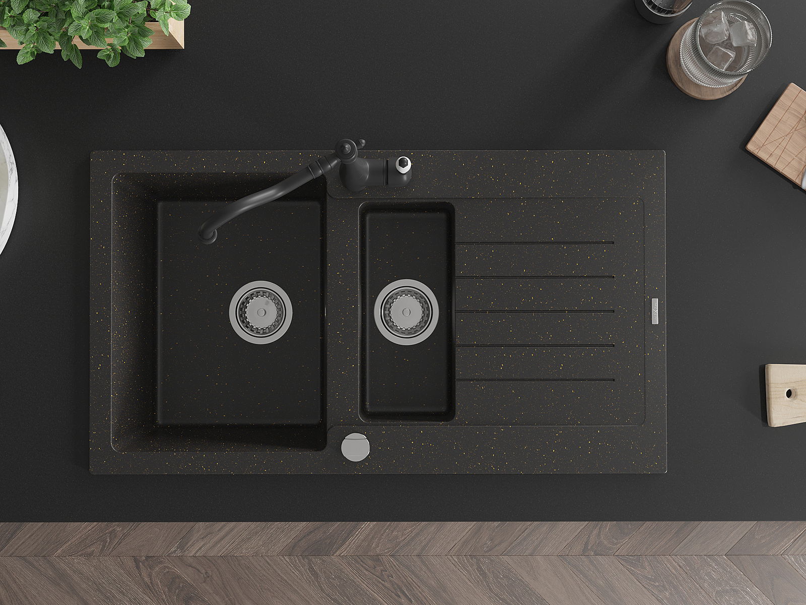 Mexen Matias dřez granitový 1,5-komorový s odkapávačem a kuchyňskou baterií Carla černý/zlatý metalik - 6502-75-670700-70