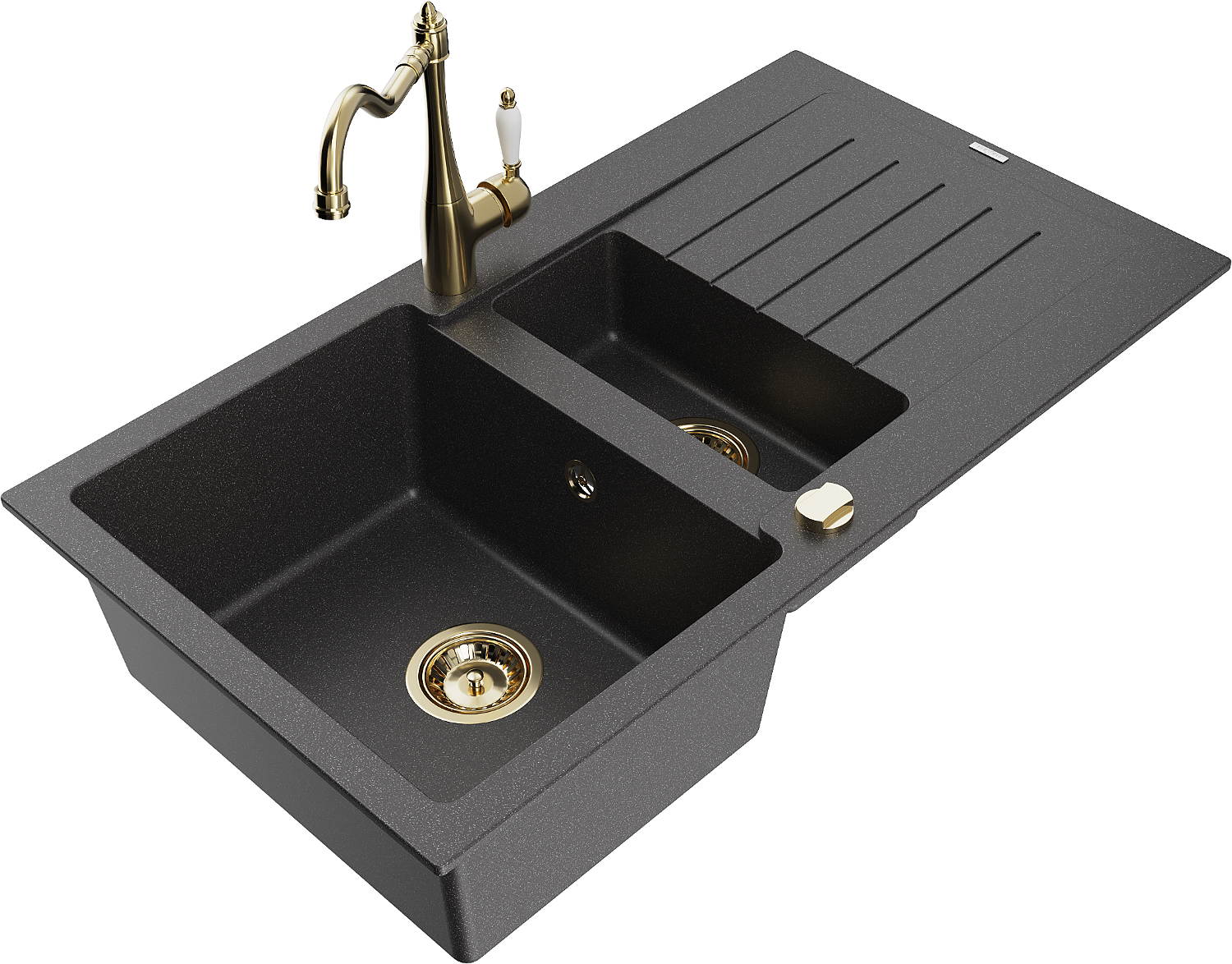Mexen Matias granitový dřez 1,5-komorový s odkapávačem a kuchyňskou baterií Carla, černý skvrnitý - 6502-76-670700-50