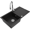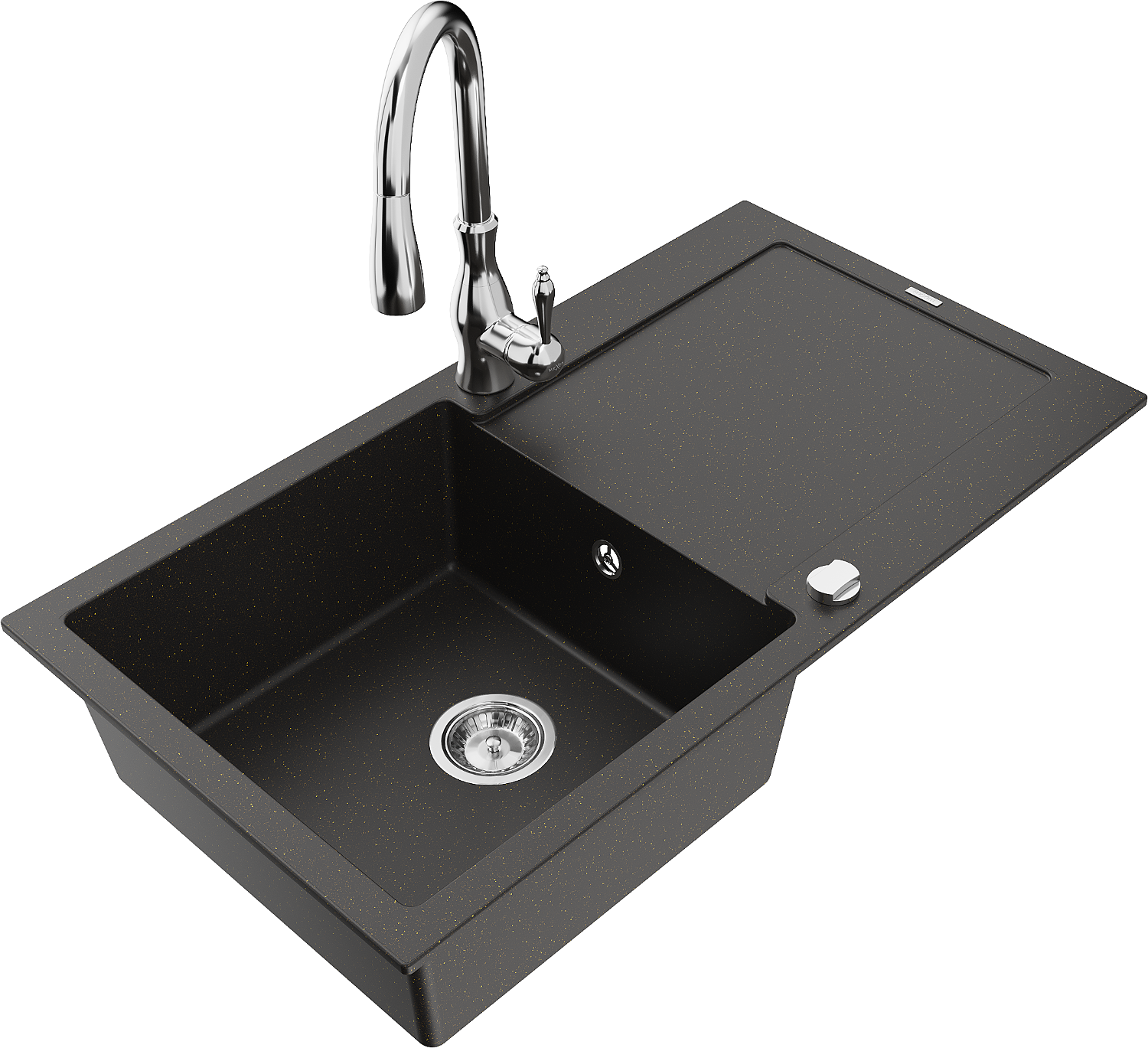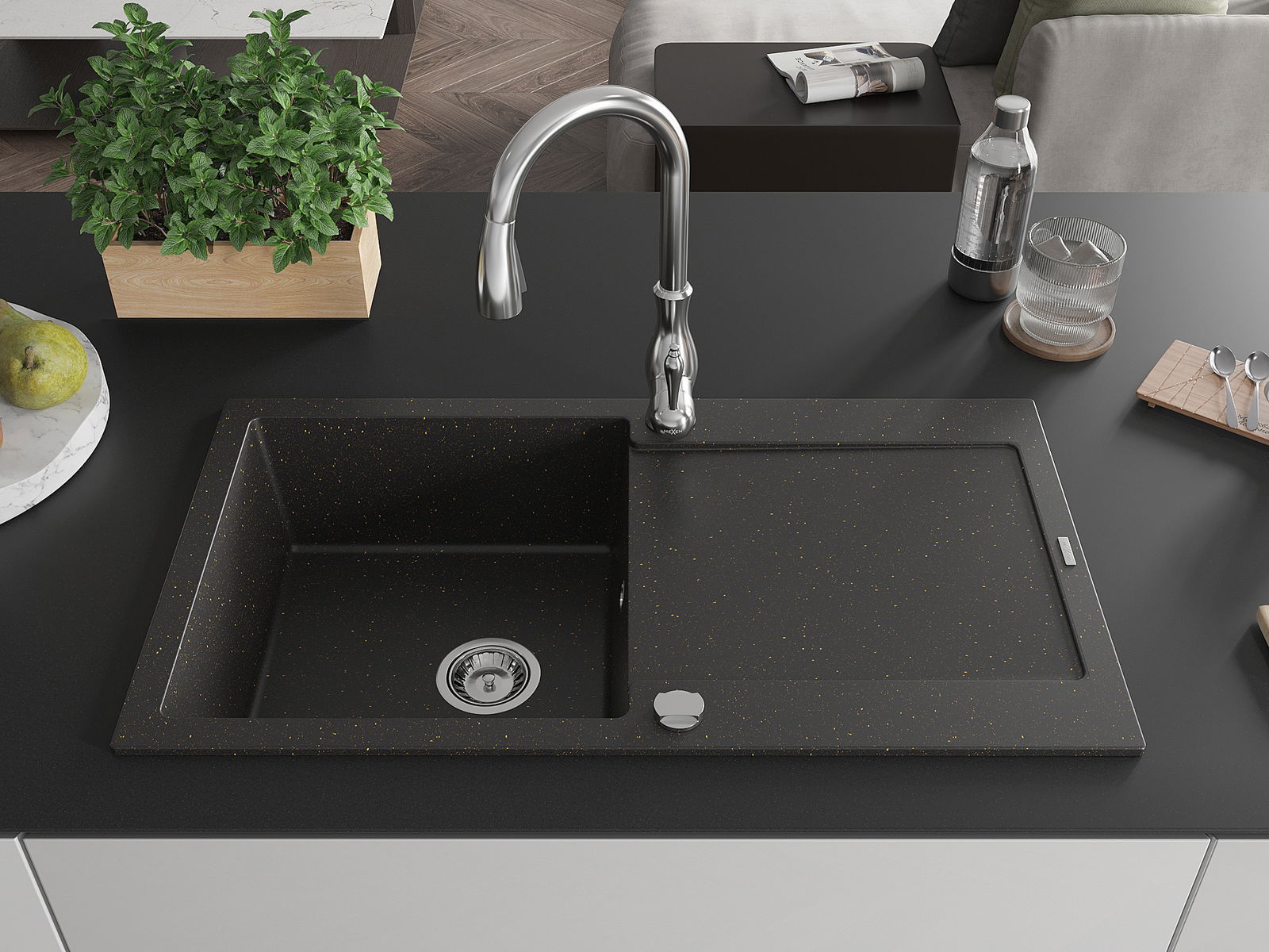 Mexen Leo žulový dřez 1-komorový s odkapávačem a kuchyňskou baterií Savita, černý/zlatý metalický - 6501-75-672601-00
