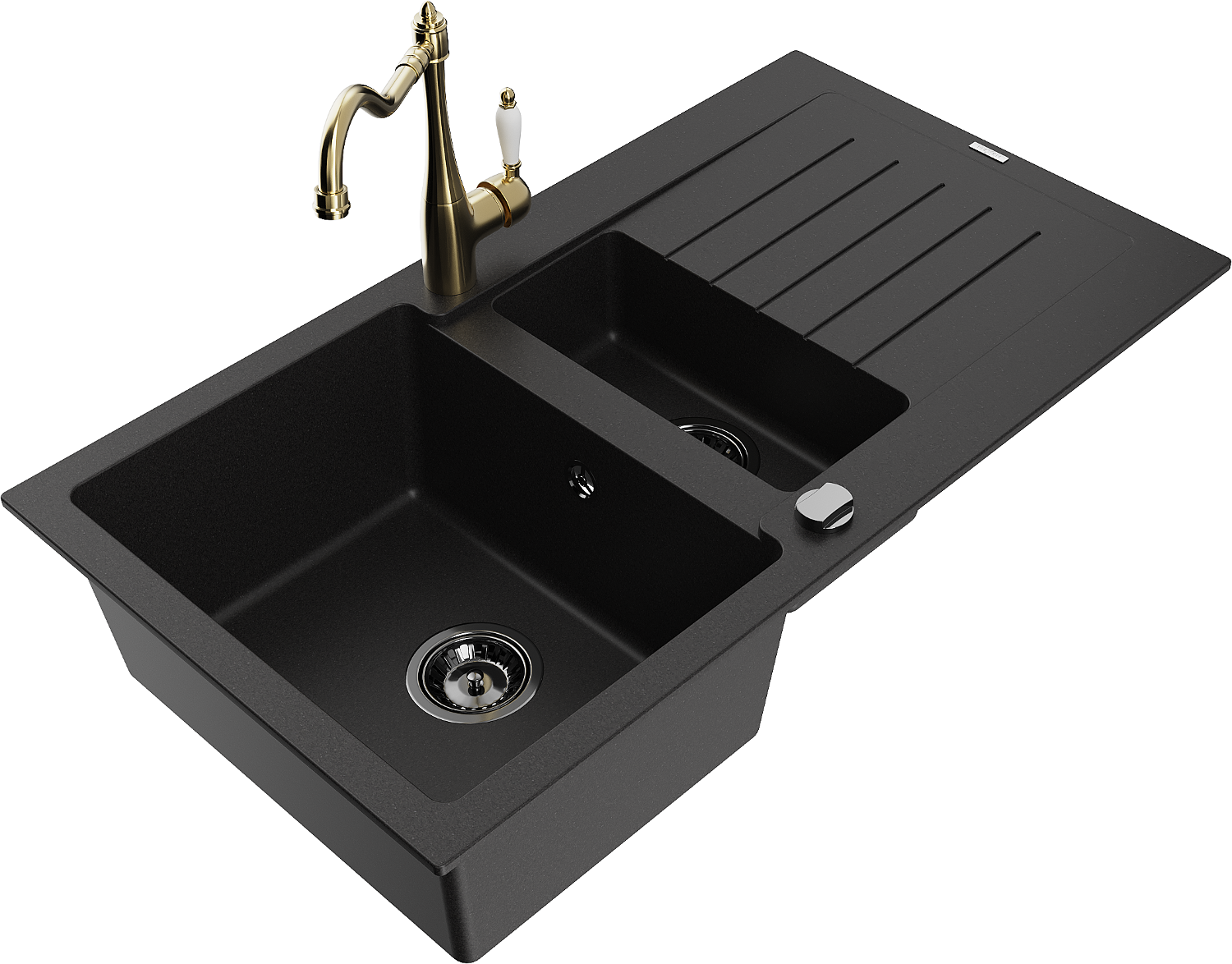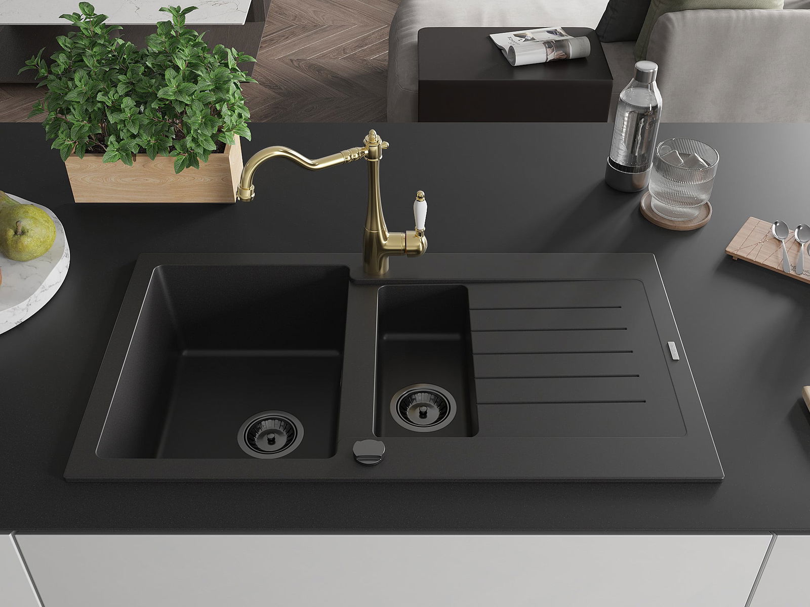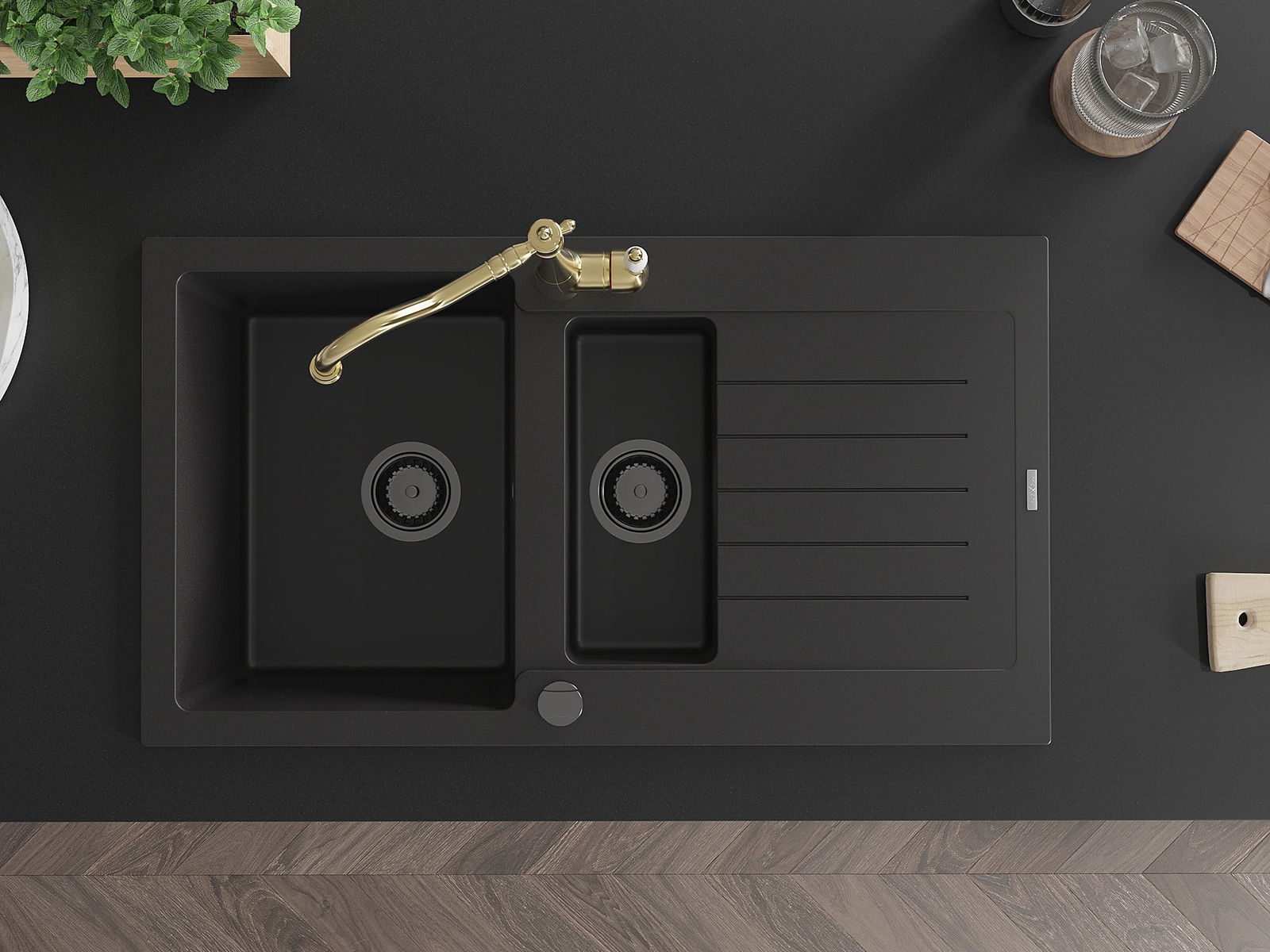 Mexen Matias granitový dřez 1,5-miskový s odkapávačem a kuchyňskou baterií Carla, černý - 6502-77-670700-50-B
