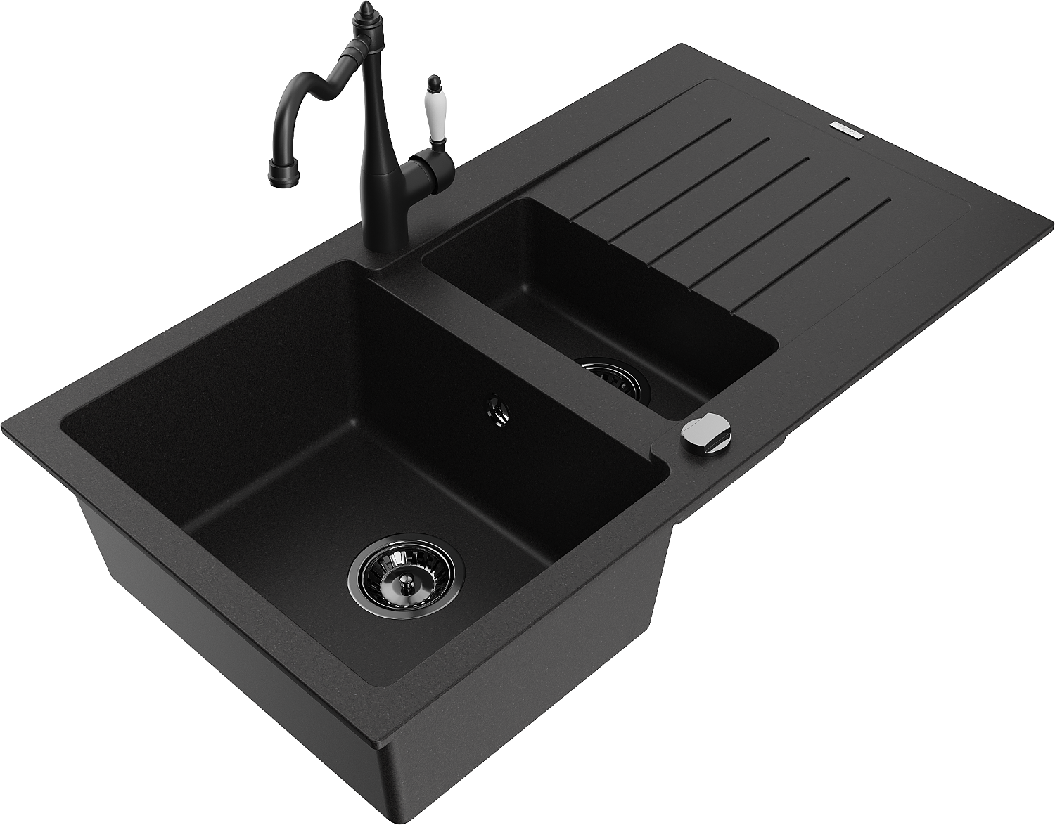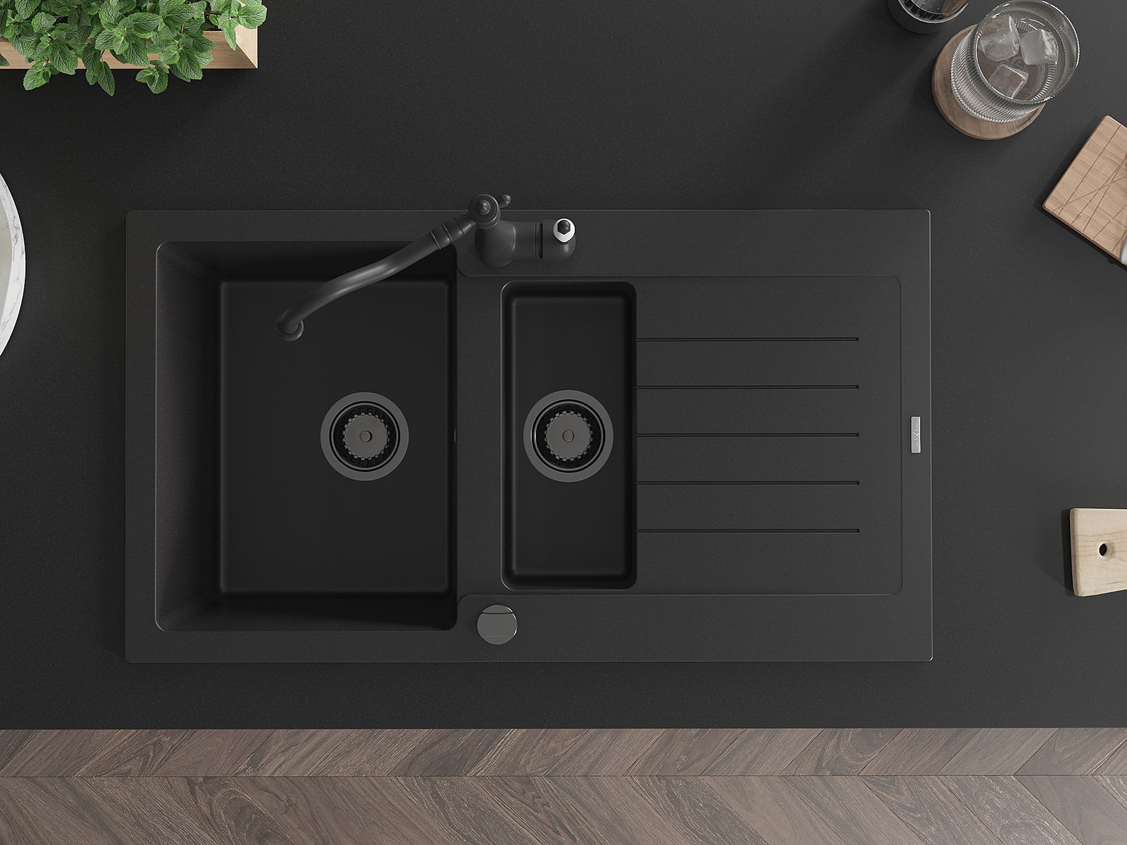 Mexen Matias granitový dřez 1,5komorový s odkapávačem a kuchyňskou baterií Carla, černý - 6502-77-670700-70-B