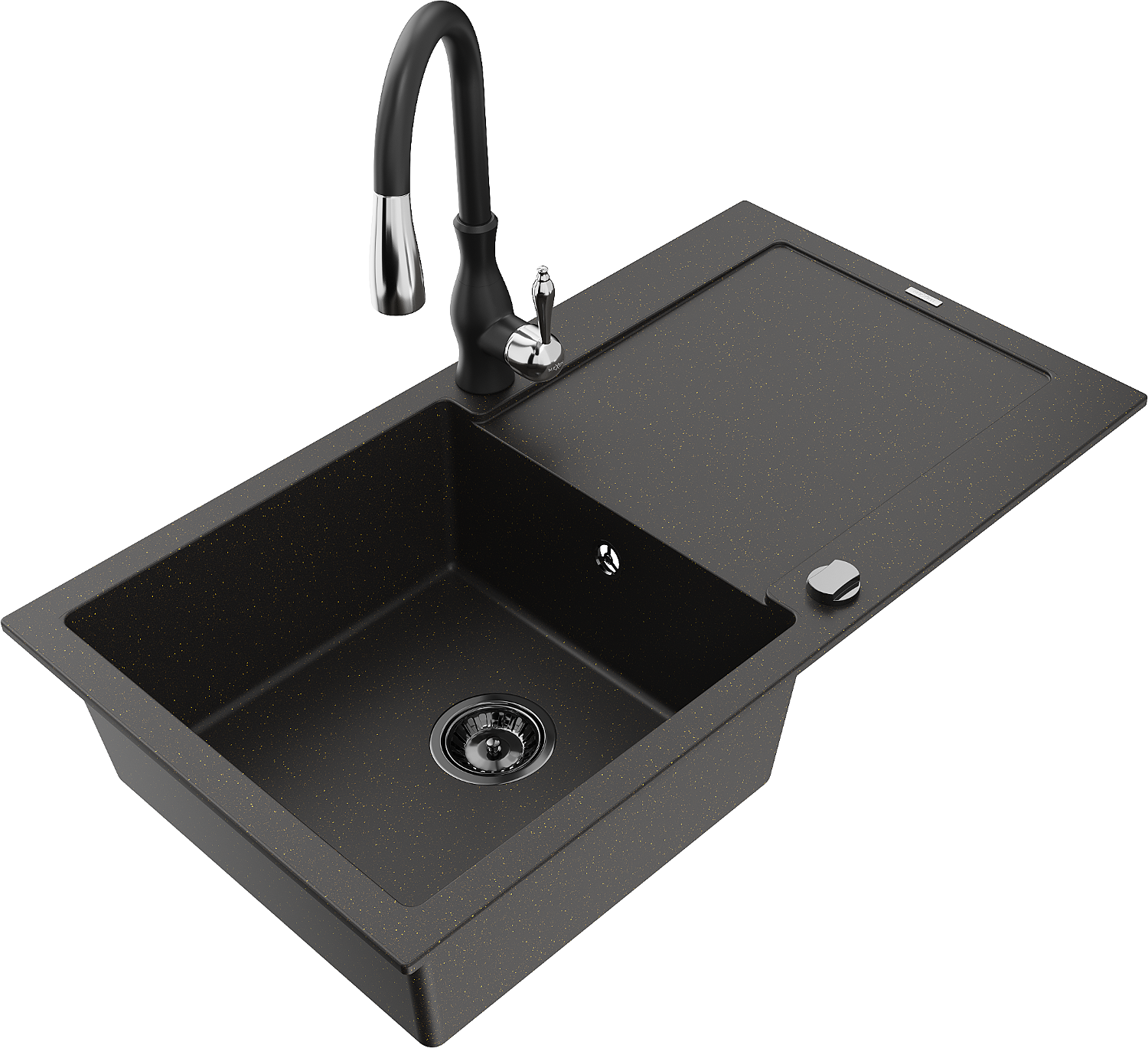 Mexen Leo granitový dřez s 1 komorou a odkapávačem a kuchyňskou baterií Savita, černý/zlatý metalik - 6501-75-672601-70-B