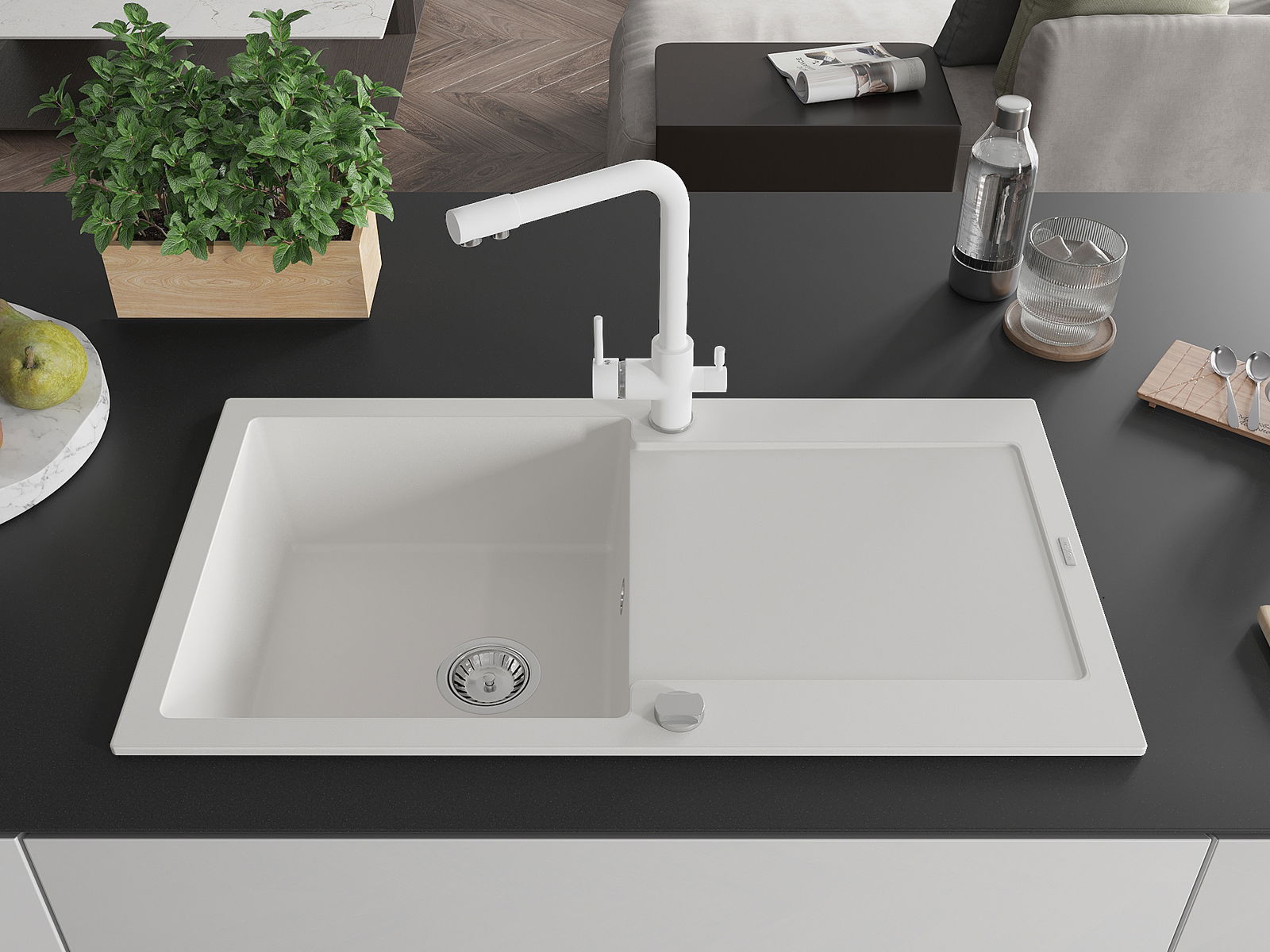 Mexen Leo granitový dřez s 1 komorou a odkapávačem a kuchyňskou baterií Duero, bílá - 6501-20-671600-20