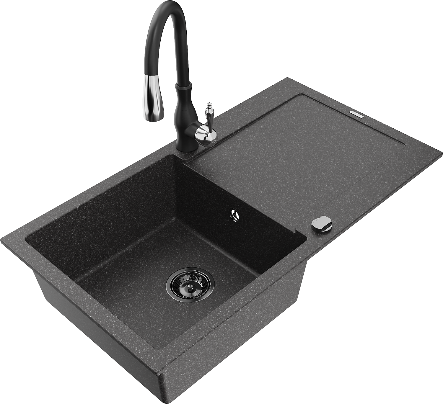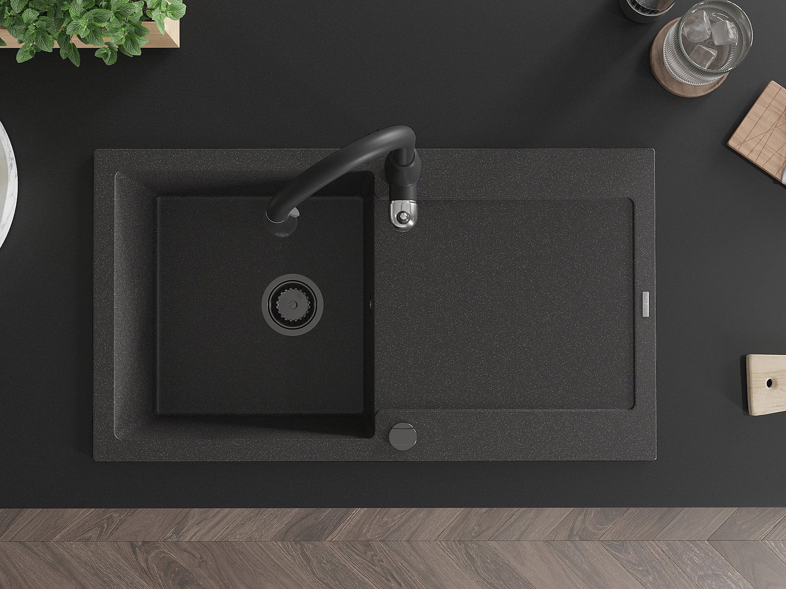 Mexen Leo granitový dřez 1-komorový s odkapávačem a kuchyňskou baterií Savita, černý skvrnitý - 6501-76-672601-70-B