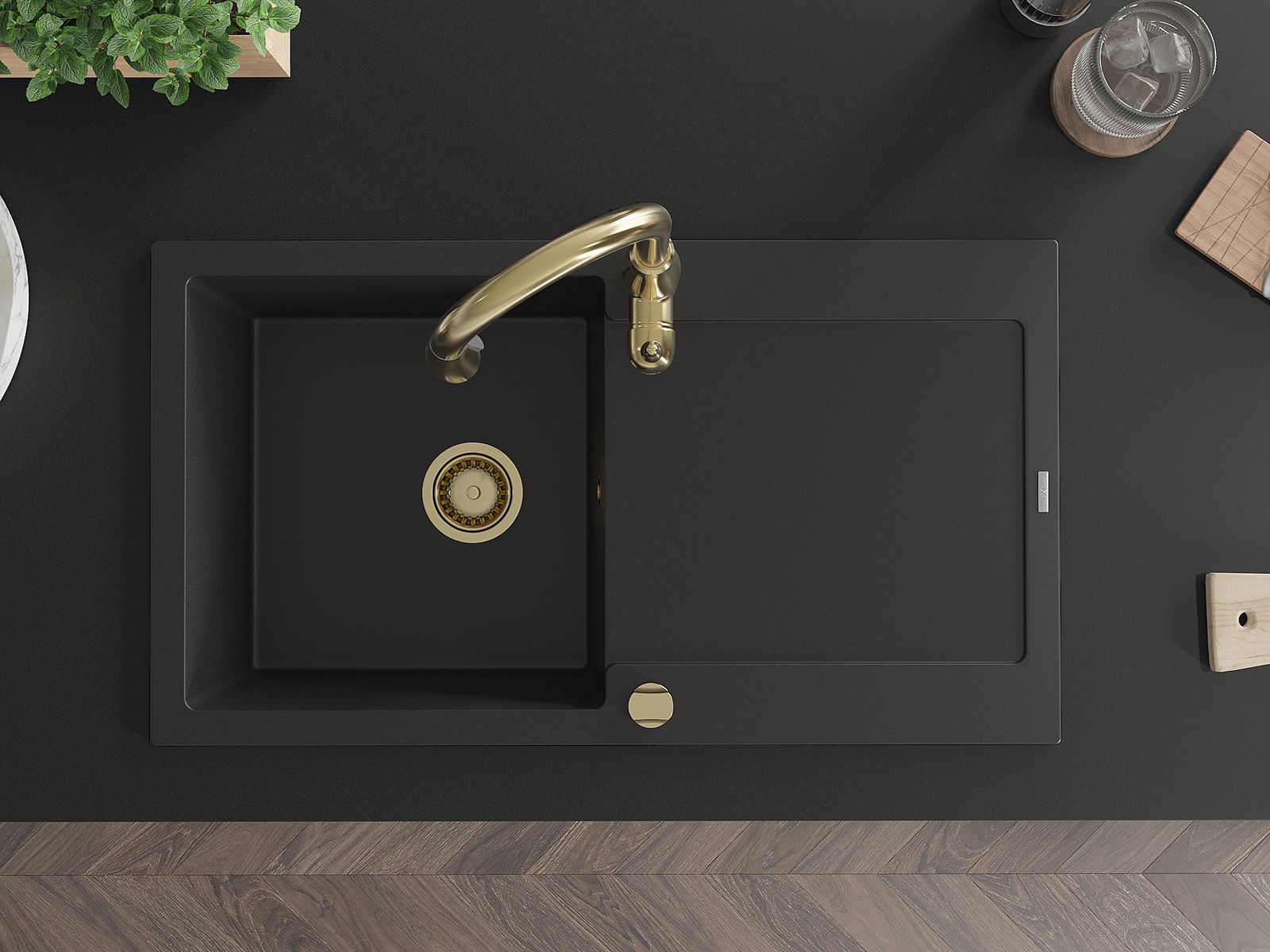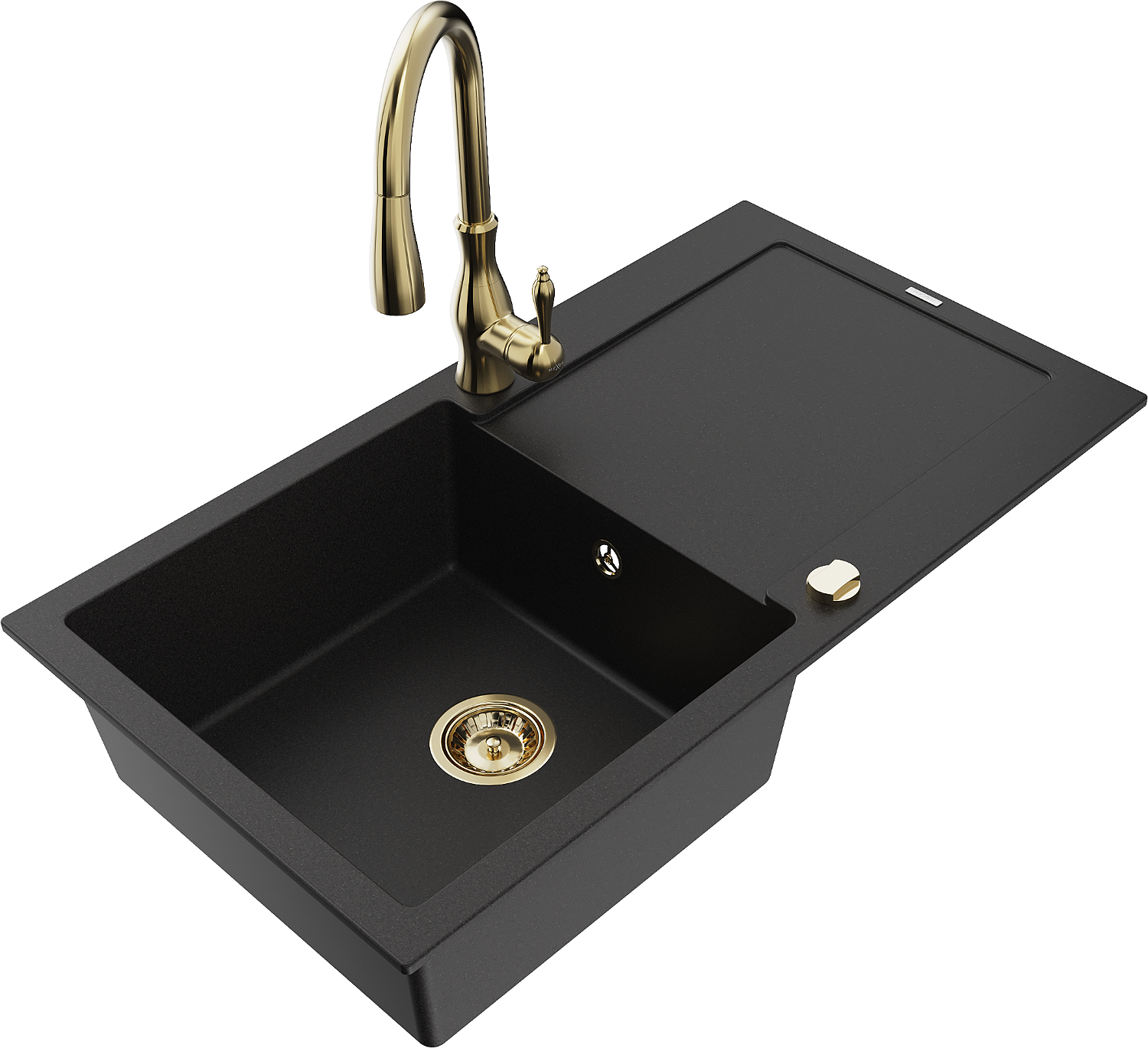 Mexen Leo granitový dřez 1-komorový s odkapávačem a kuchyňskou baterií Savita, černý - 6501-77-672601-50