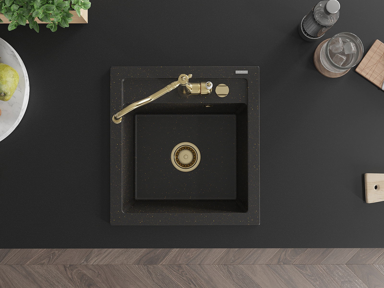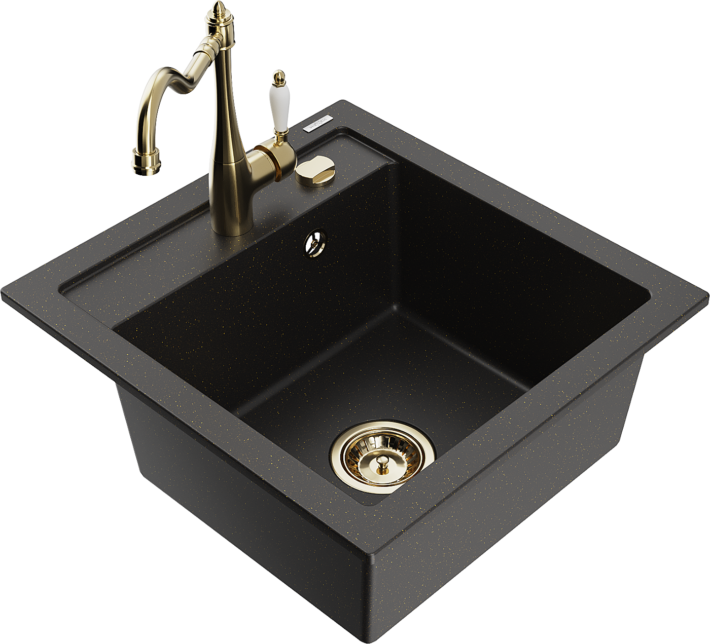 Mexen Vito granitový kuchyňský dřez s 1 komorou a kuchyňskou baterií Carla, černý/zlatý metalický - 6503-75-670700-50