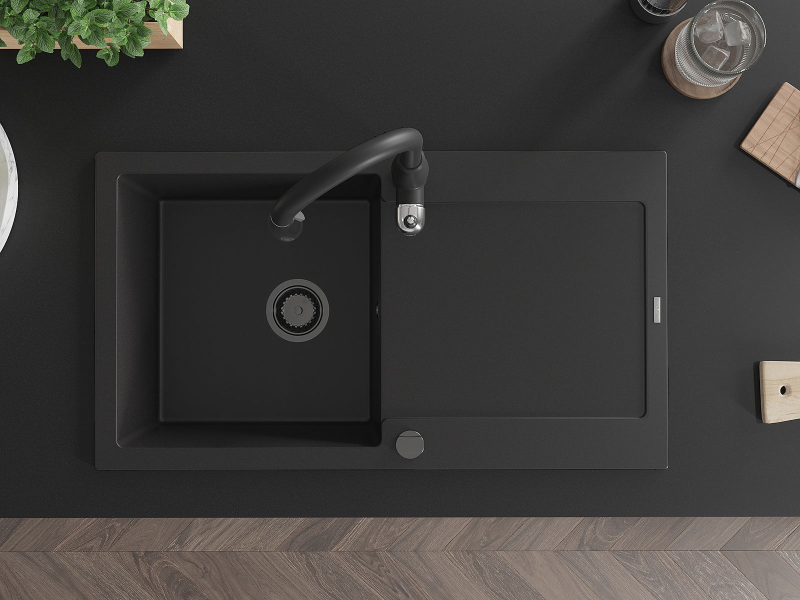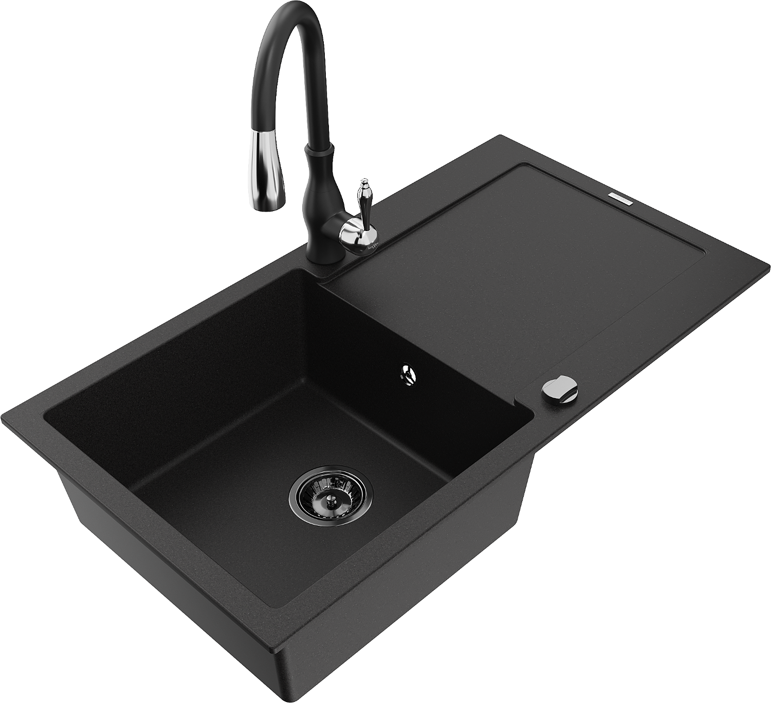 Mexen Leo granitový dřez 1-komorový s odkapávačem a kuchyňskou baterií Savita, černý - 6501-77-672601-70-B