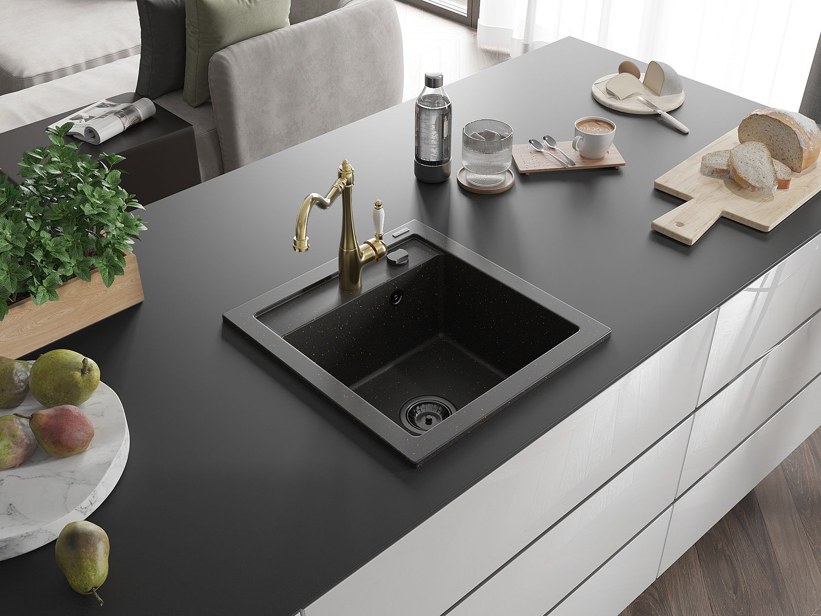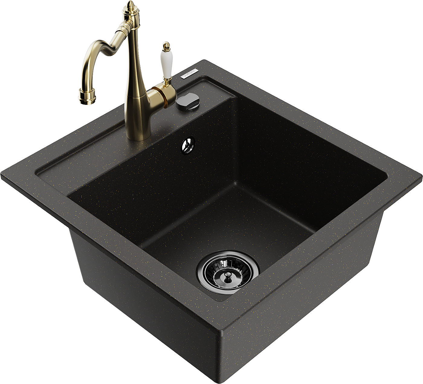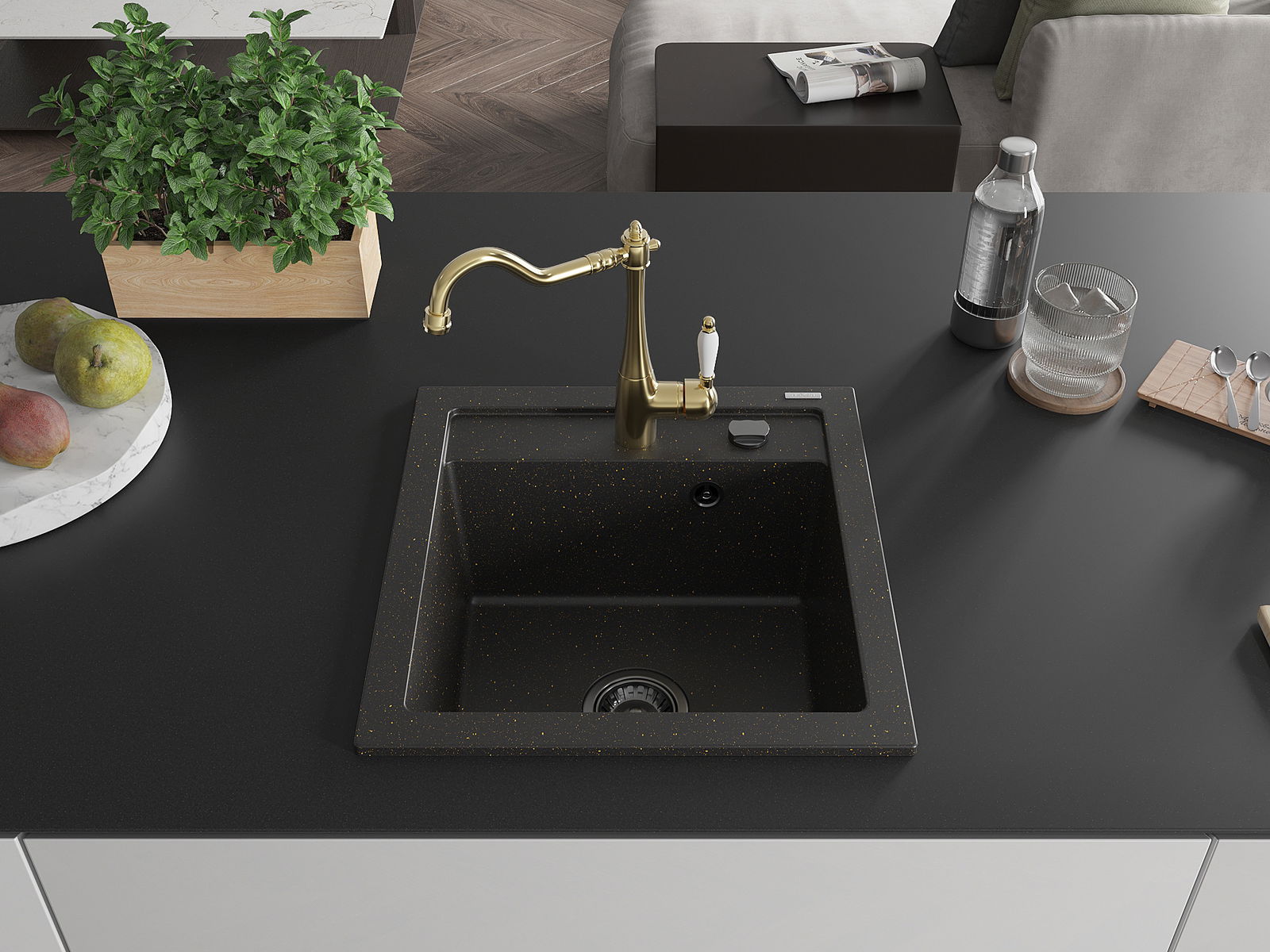 Mexen Vito granitový dřez 1-komorový s kuchyňskou baterií Carla, černý/zlatý metalický - 6503-75-670700-50-B