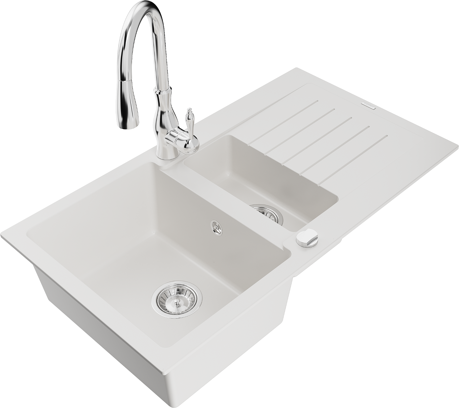 Mexen Matias granitový dřez 1,5-komorový s odkapávačem a kuchyňskou baterií Savita, bílý - 6502-20-672601-00
