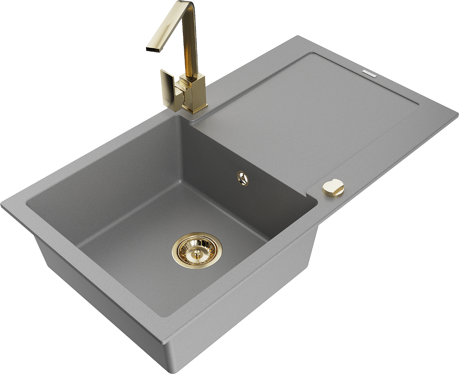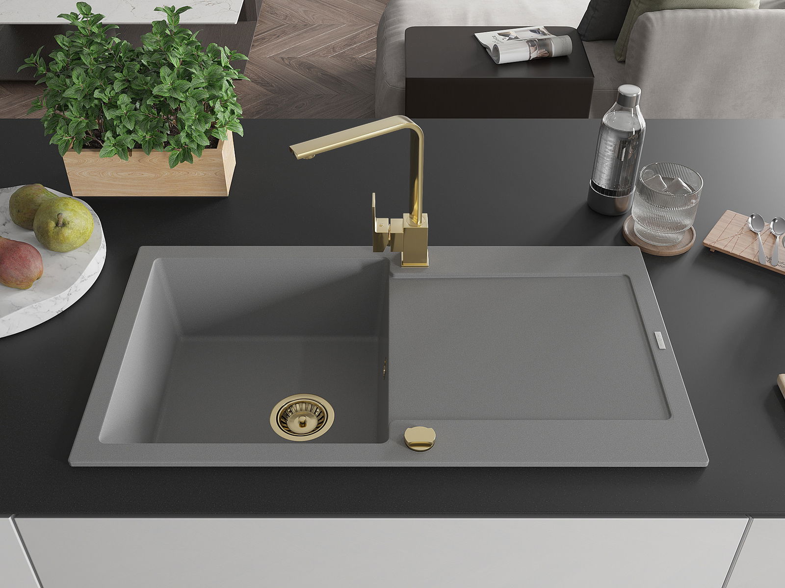 Mexen Leo granitový dřez 1-komorový s odkapávačem a kuchyňskou baterií Rita, šedý - 6501-71-670300-50