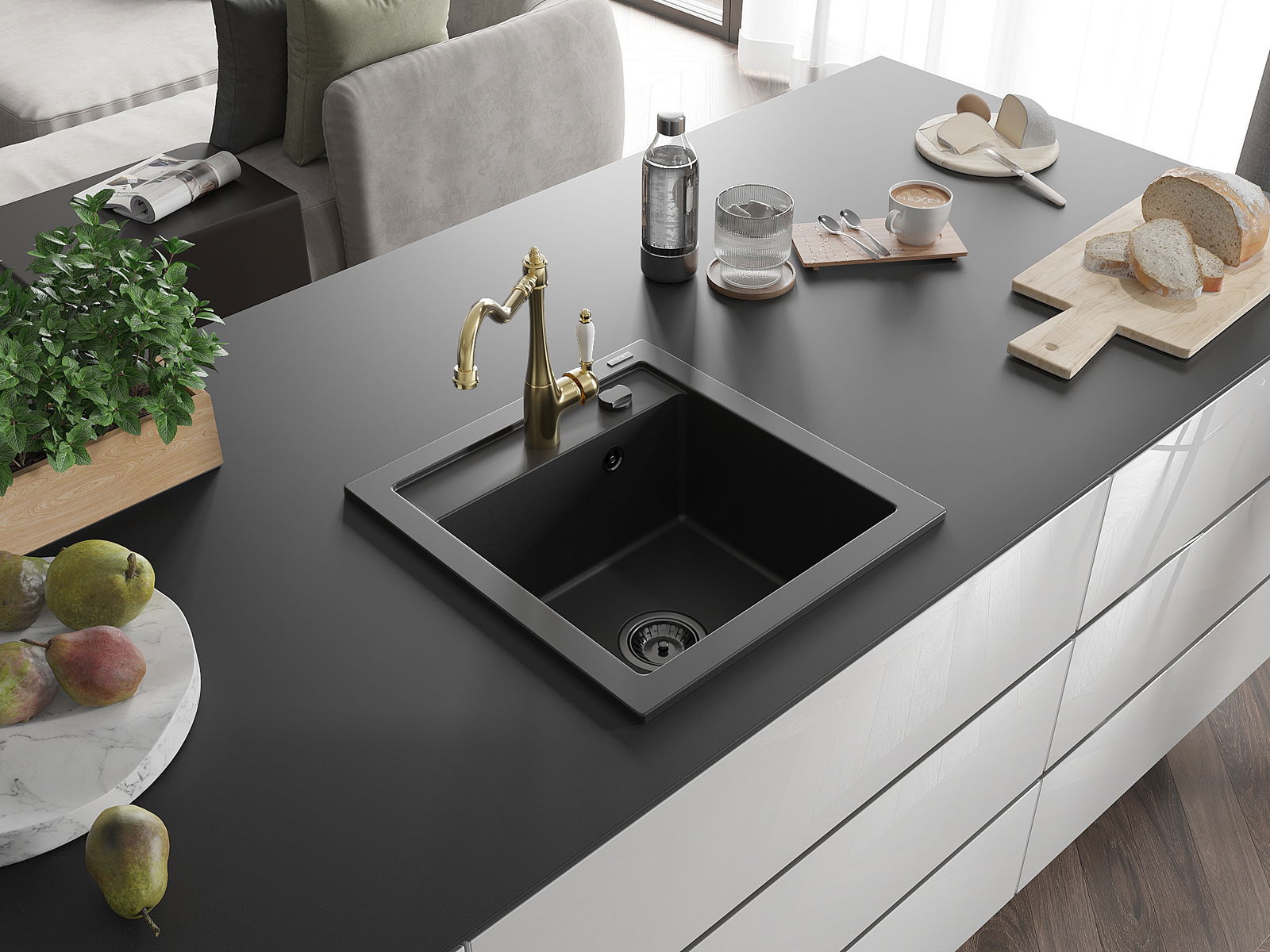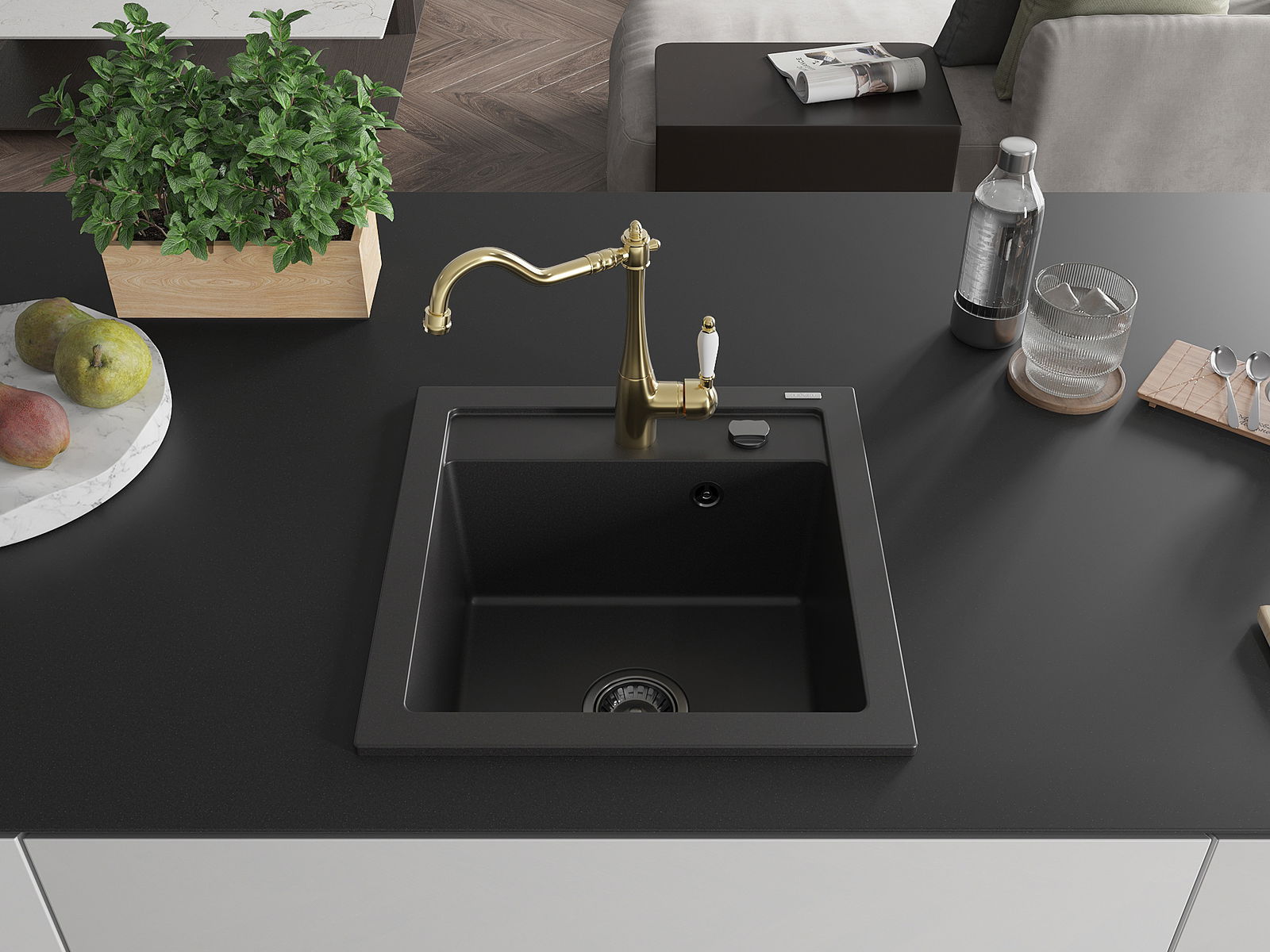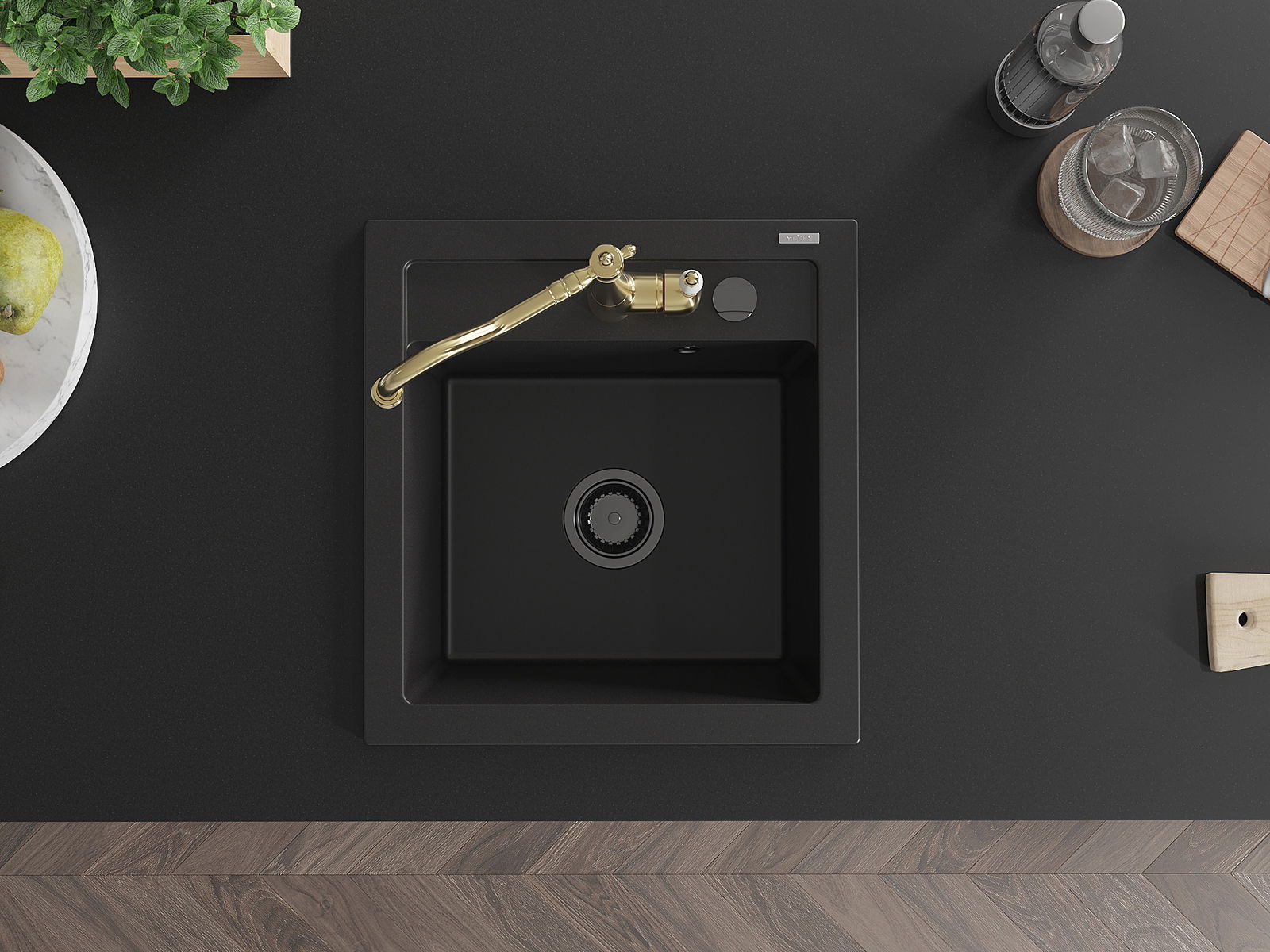 Dřez má předfrézovaný otvor o průměru 35 mm k samostatnému proražení. Může být použit například k montáži dávkovače na tekutinu, který eliminuje přítomnost plastových lahví v kuchyni a dodá jí elegantní finiš.