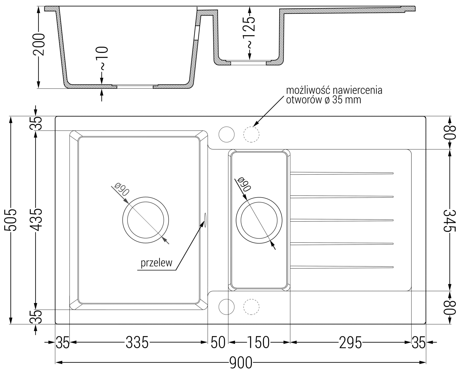 Dřez má 2 předvrtané otvory o průměru 35 mm, které lze samostatně vyrazit. Mohou být použity mimo jiné k montáži dávkovače tekutin, který eliminuje přítomnost plastových lahví v kuchyni a dodá jí elegantní vzhled.