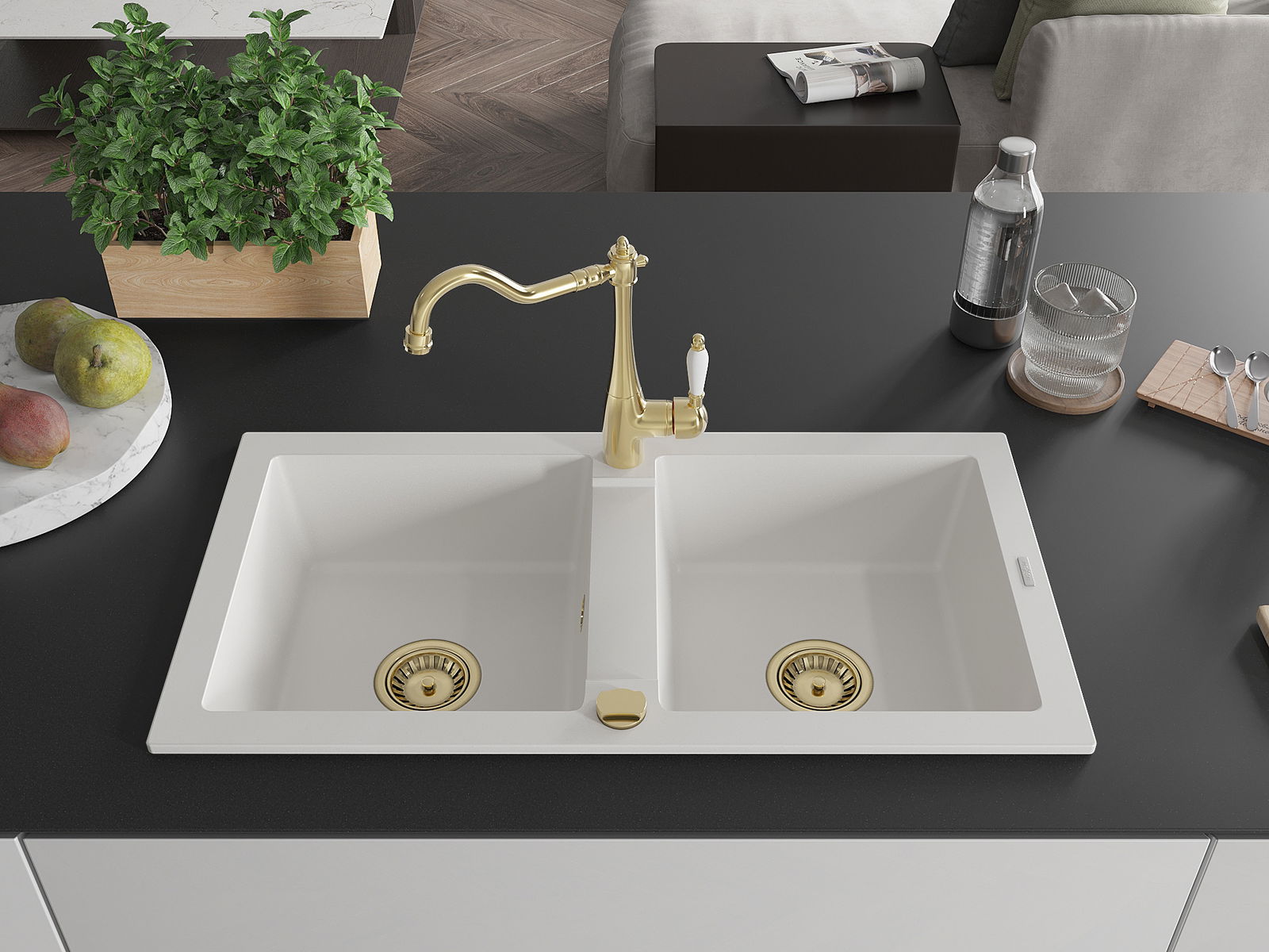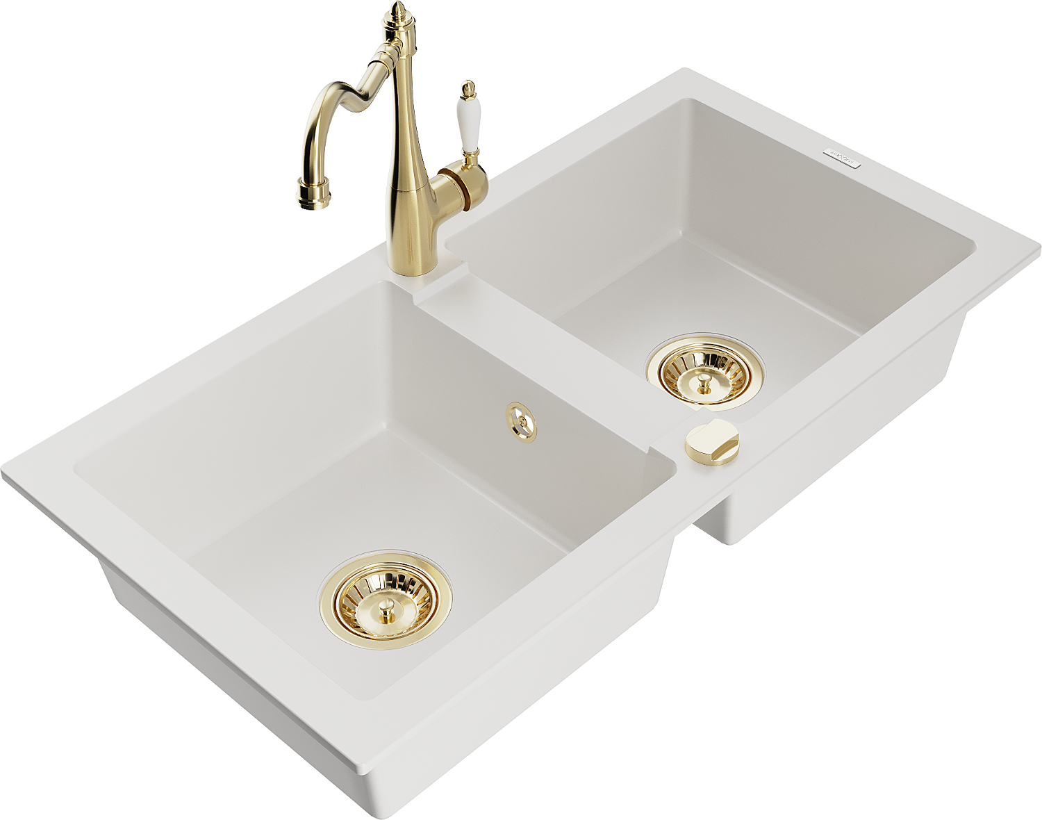 Mexen Mario dvoukomorový žulový dřez s kuchyňskou baterií Carla, bílý - 6504-20-670700-50