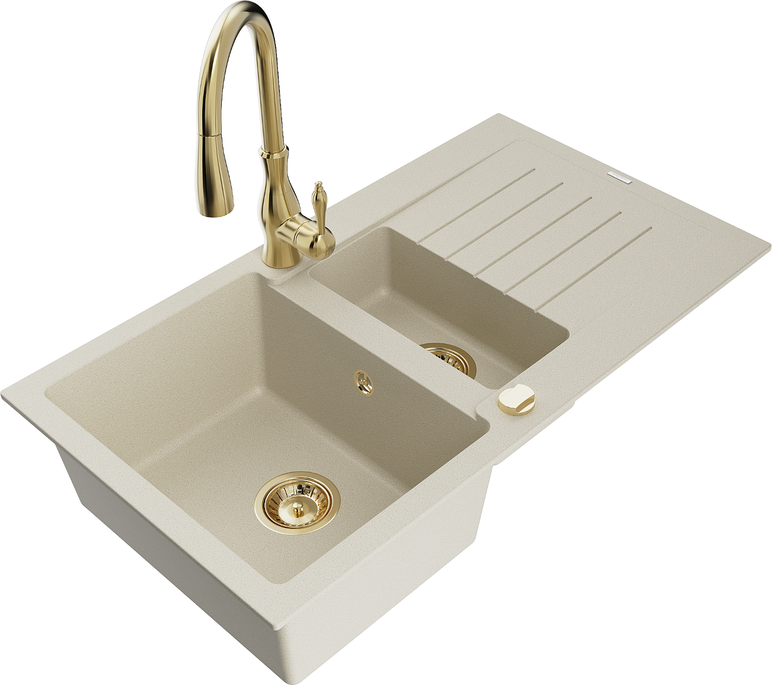Mexen Matias granitový dřez 1,5-komorový s odkapávačem a kuchyňskou baterií Savita, béžový - 6502-69-672601-50