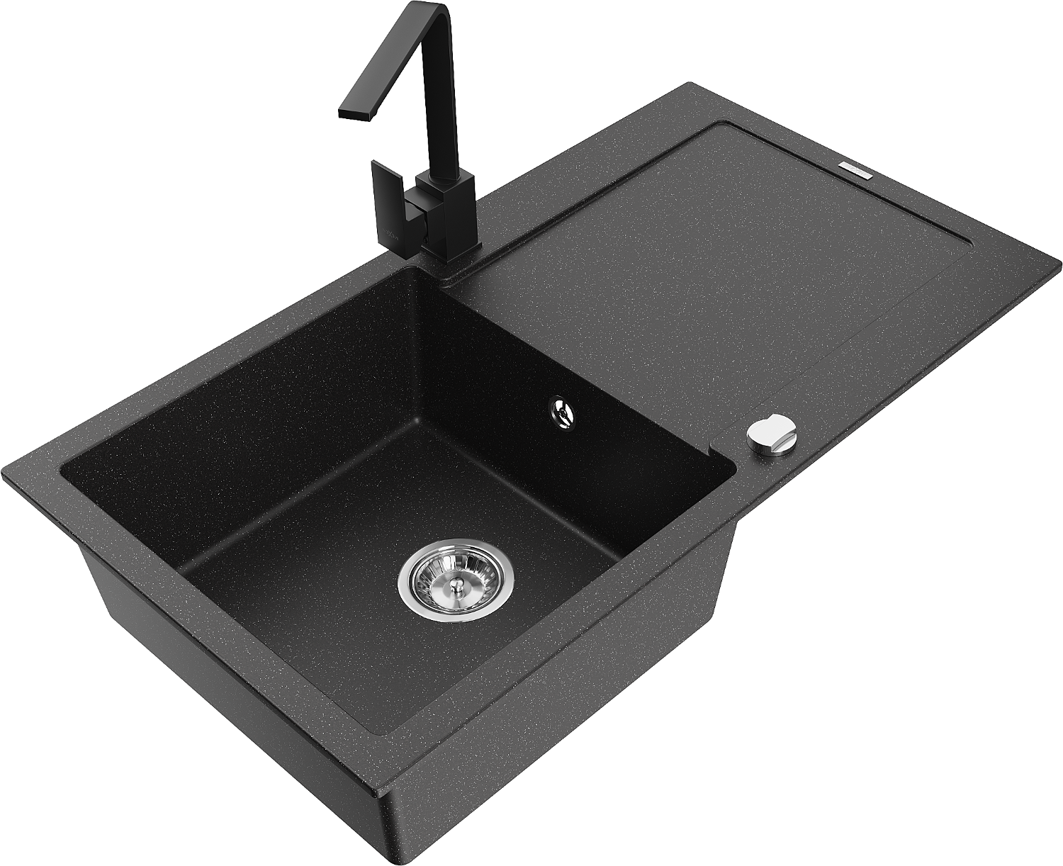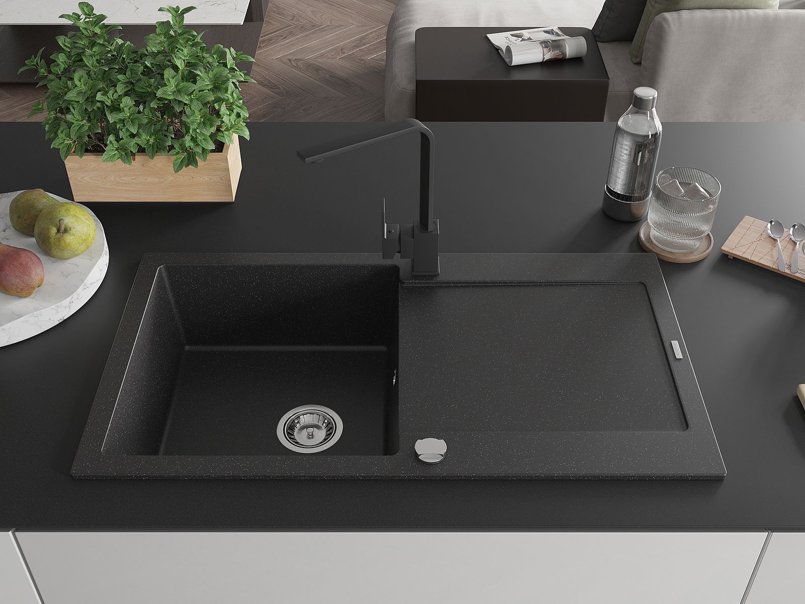 Mexen Leo granitový dřez 1-komorový s odkapávačem a kuchyňskou baterií Rita, černý/stříbrný metalík - 6501-73-670300-70